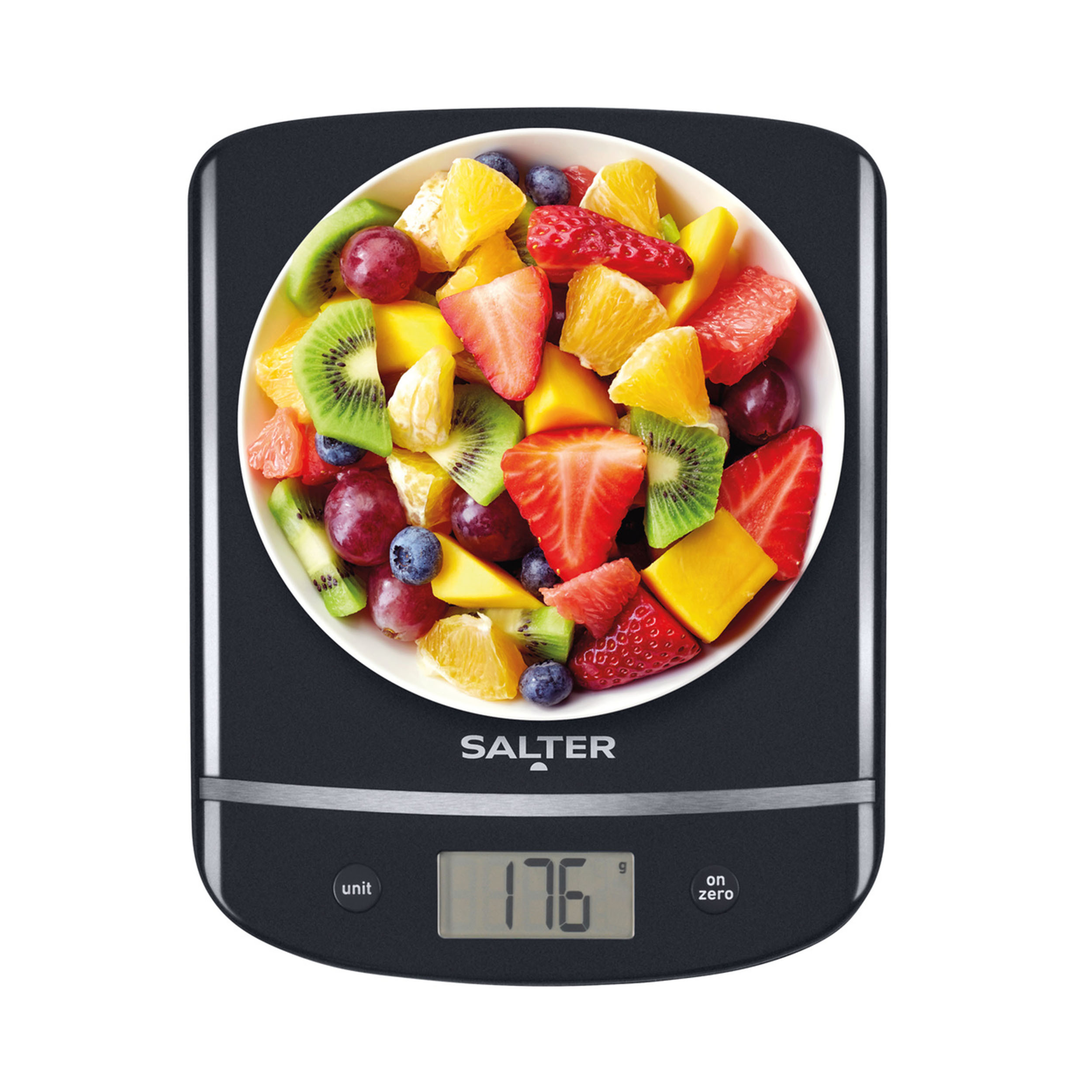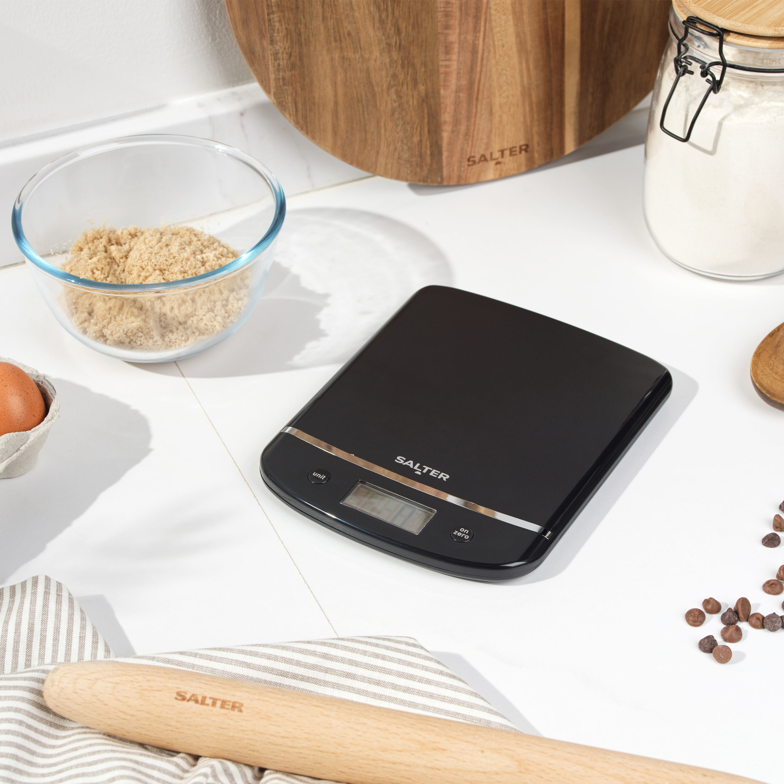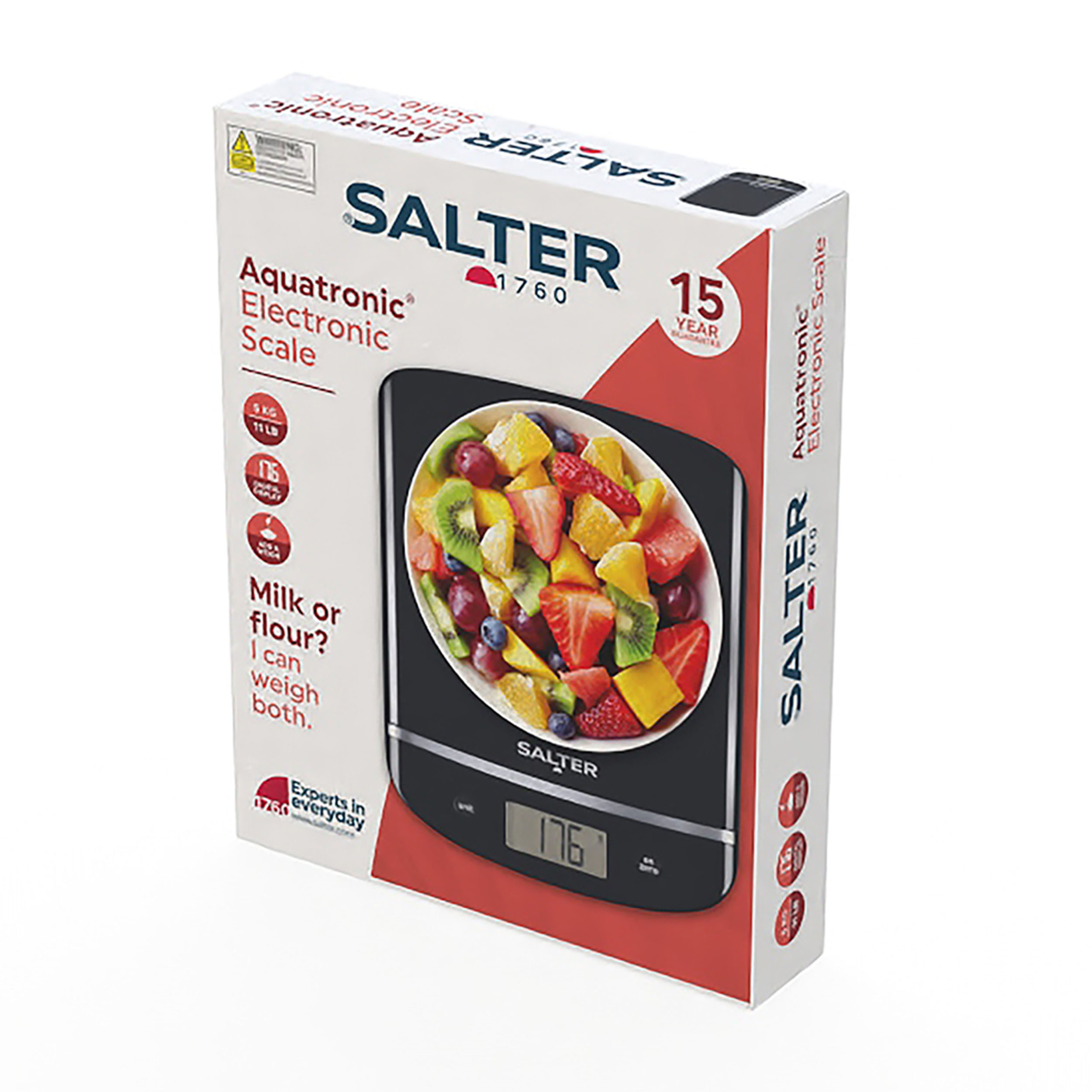 Whether you need to weigh milk or flour, this Salter kitchen scale has an Aquatronic function to measure wet and dry ingredients accurately. Perfect for baking, this digital food scale has an add-and-weigh feature to measure multiple ingredients together in one bowl! You can also weigh directly onto the easy clean platform. With a 5kg/11lbs maximum capacity, you can follow any recipe easily and measure precisely with an easy-to-read LCD display.