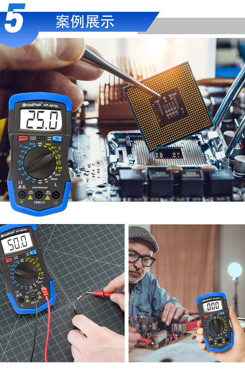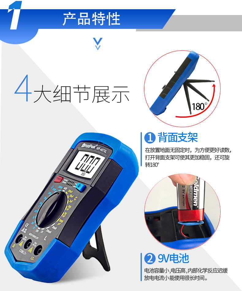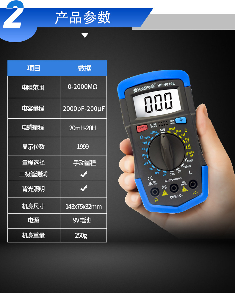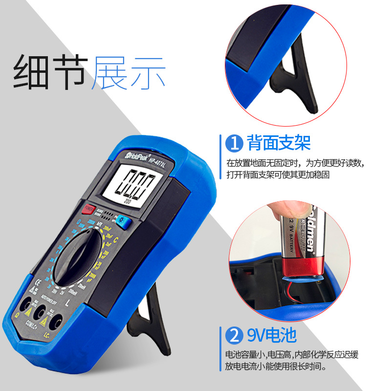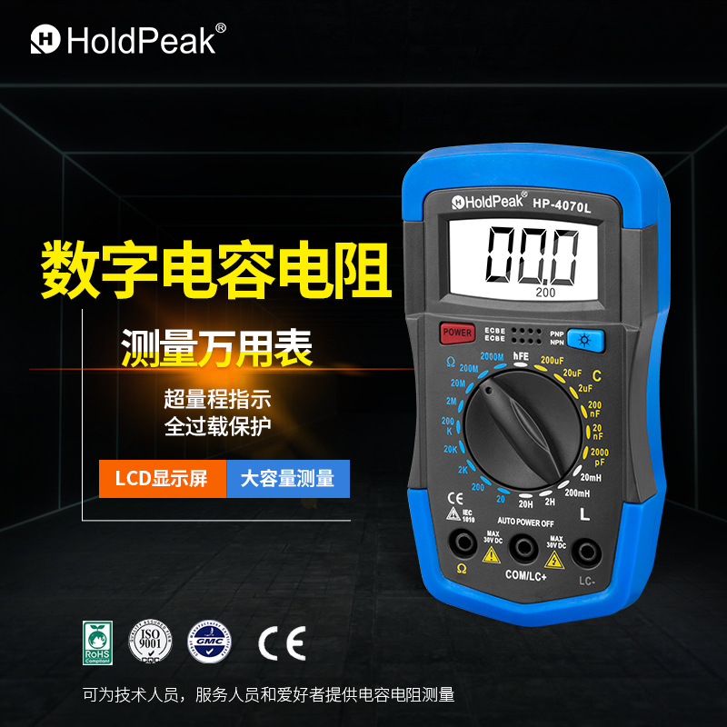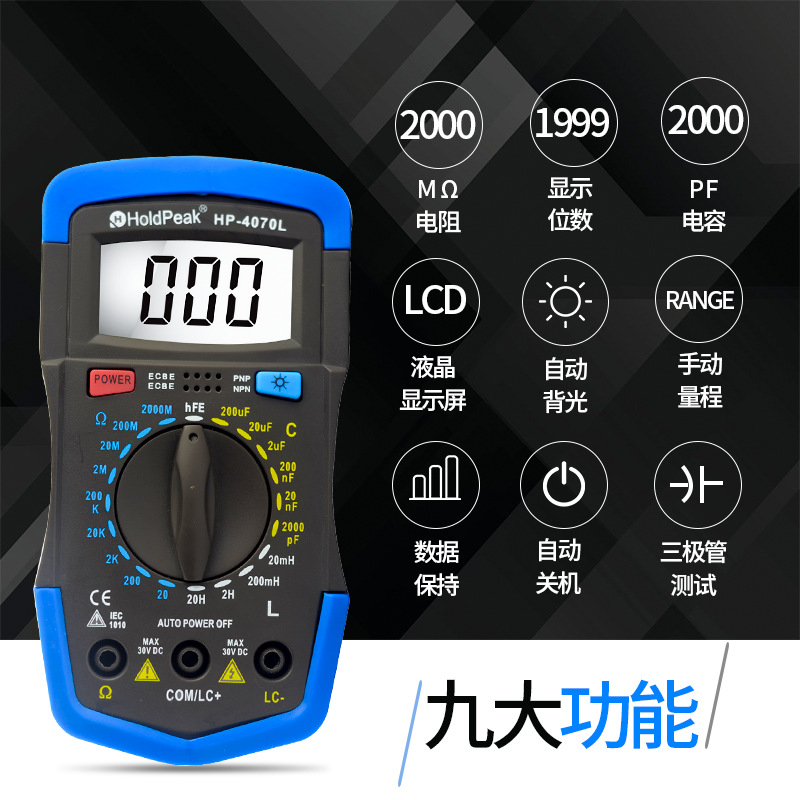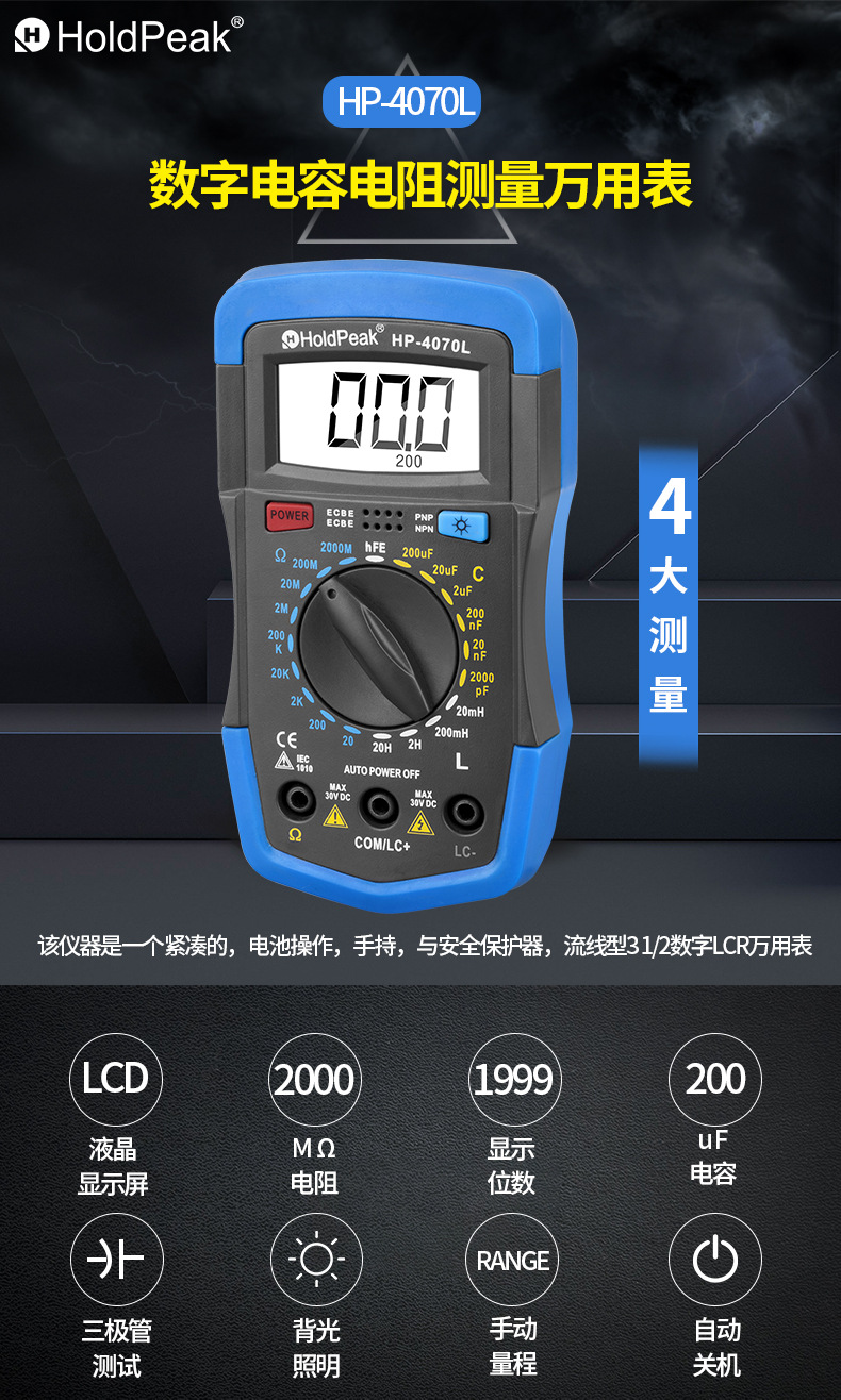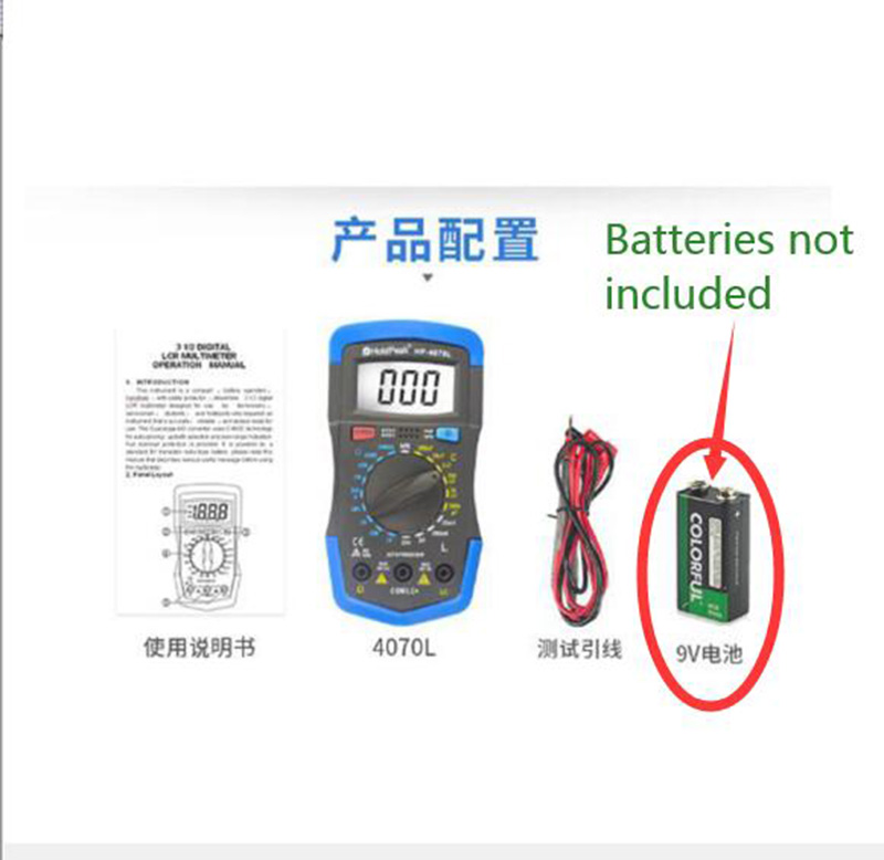 Specification: 6 Capacitance Measuring Ranges : 1pF to 200uF Range 1 to 5 : 2000pF / 20nF / 200nF / 2uF / 20uF, +/-2. 5 ; Range 6 : 200uF, +/-7% ; 4 Inductance Measuring Ranges :20mH / 200mH / 2H / 20H, +/- 2.5%, + 5 digits; 9 Resistance Measuring Ranges :20 / 200 / 2K / 20K / 200K / 2M / 20M / 200M / 2000M Ohms, +/- 1. 2 to 5% ; Transistor hFE Measurement :NPN , PNP hFE ( 10 to 1,000 ) Max Display : "1999", 3 1/2 Digits, Backlight control Auto Zero adjustment. Power : 9V DC battery ( 6F22 ) Low battery / overflow indication on display Operating Temperature / Humidity : 0 -40C, RH<75% Accessories : Instruction manual, test leads Charges from 0% to approximately 85% in about 45 minutes Note: does not include battery Package included: 1 x LCR, RCL INDUCTANCE, CAPACITANCE, RESISTANCE METER (Batteries not included) 1 x Test Leads |