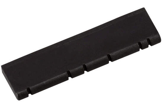 Our molded Delrin mountain dulcimer bridge/nut pieces are black colored and fit our pre-slotted fingerboards, or any fingerboard with 1/8" wide bridge/nut slots. The grooves molded into the top edge of our bridge/nut pieces are appropriate for both three and four-string dulcimers. These bridge/nut pieces are 1/8" thick, 3/8" high and 1 3/8" wide.