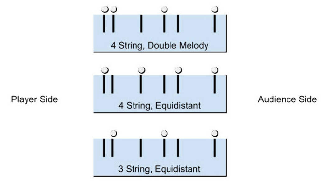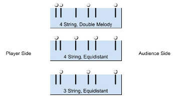 The second photo above (with three blue diagrams) shows some of the different ways that you can set up our Delrin nut and bridge pieces. In our diagrams, the small circles above the string slots represent the strings.