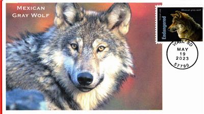 This first day cover featurest the Mexican Gray. The stamp is from the USPS set featuring 20 Endangered Species. It is cancelled for the official First Day of Issue with a round postmark on May 19, 2023 at Wall, SD. This is one of 20 all diferent cacheted first day covers for each stamp of the set. Contact seller Greatfdcs09 if interested in the full set or any other individual covers. The envelope measures approximately 3 1/2 " X 6 1/4" . Fewer than 10 made like this. Makes a great gift. I combine shipping, so the buyer saves on shipping for multiple items purchased together. Items are shipped in a poly sleeve and protected by cardboard inside an outer envelope marked DO NOT BEND.