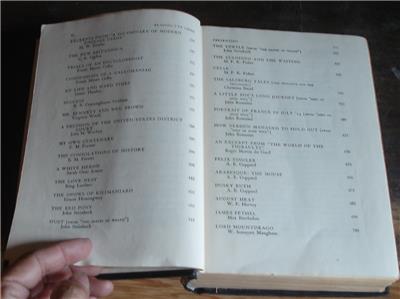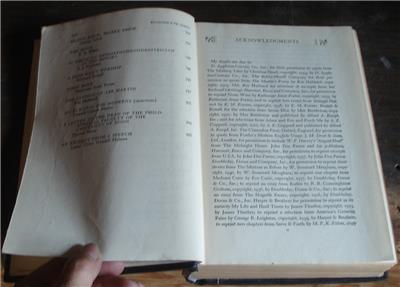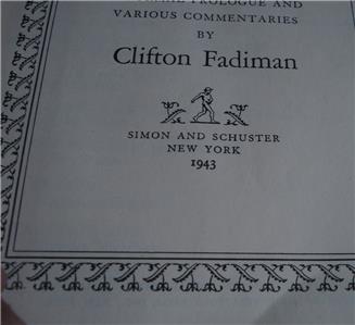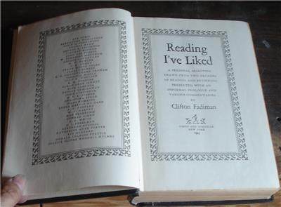 You are bidding on this nice 1943 edition hard cover copy of Reading I've Liked, A Personal Selection Drawn from Two Decades of Reading and Reviewing Presented with an Informal Prologue and Various Commentaries by Clifton Fadiman. The book has a copyright date of 1941, and is the 1943 Sixth Printing. It was published by Simon & Schuster. It is in good condition, especially for its age. The cover has some light wear at the corners and edges, and some light scuffs and stains on it, but the spine and binding are good, although the binding is beginning to loosen, especially at the front and back covers, and all 908 pages are intact and in good condition, although a little yellowed with age. The book is 8.75" long, 6" wide, and 1.5" thick. There is a name hand written inside the front cover with the date 2/14/48 This is a nice hard cover early edition of a nice book with a lot of interesting reading…