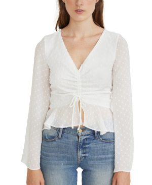 Perfectly charming, this dotted Swiss peplum top from Lucy Paris features a cropped hem and adjustable drawcords in front. Sheer sleeves complete the look.