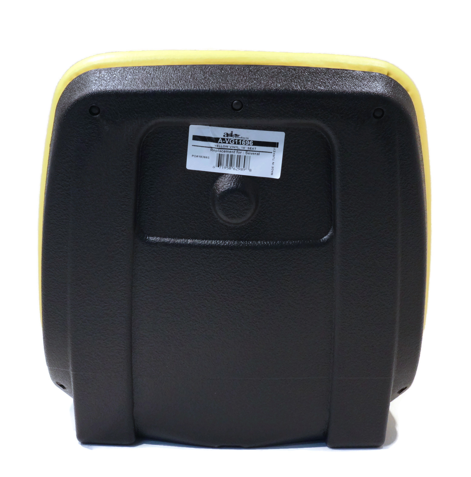 • Specs - Seat Back Height: 18". Color: Yellow. Material: Vinyl. Corrosion resistant. Refer to images 2 & 3 for more information