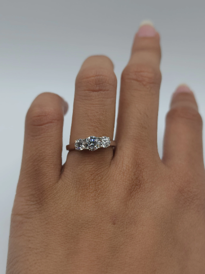 Center diamond is 0.50 Ct and each side diamond is 0.25 Ct for a total of 1 Carats