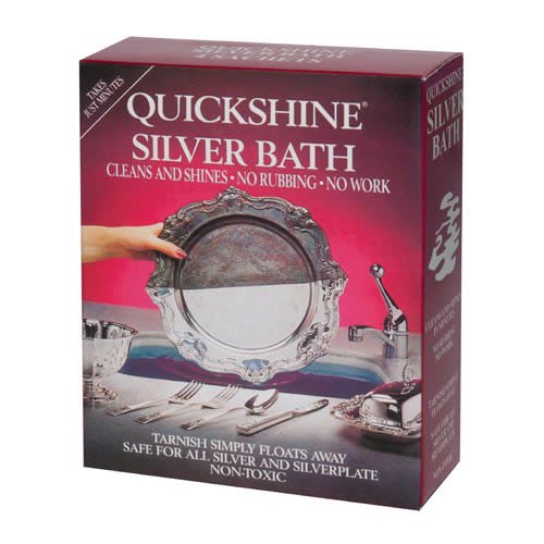 Quickshine Silver Bath Cleans & shines! No rubbing. No work. Tarnish simply floats away. Safe for all silver & silver plate. Non Toxic. Pack contains 4 x 50g sachets of Quickshine Silver Bath.