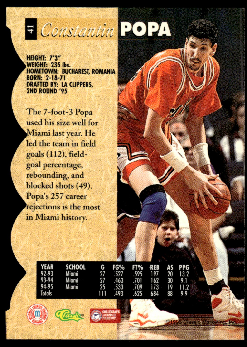 | Description: | Constantin Popa | | Category: | Basketball | | Year: | 1995 | | Product: | Classic 5-Sport Die-Cut | | Team: | Miami Hurricanes | | Card Number: | 41 | | Rookie: | Yes | | Dimensions: | 4¾" x 3¼" | | SKU: | BK B0014 R05 F (5) |