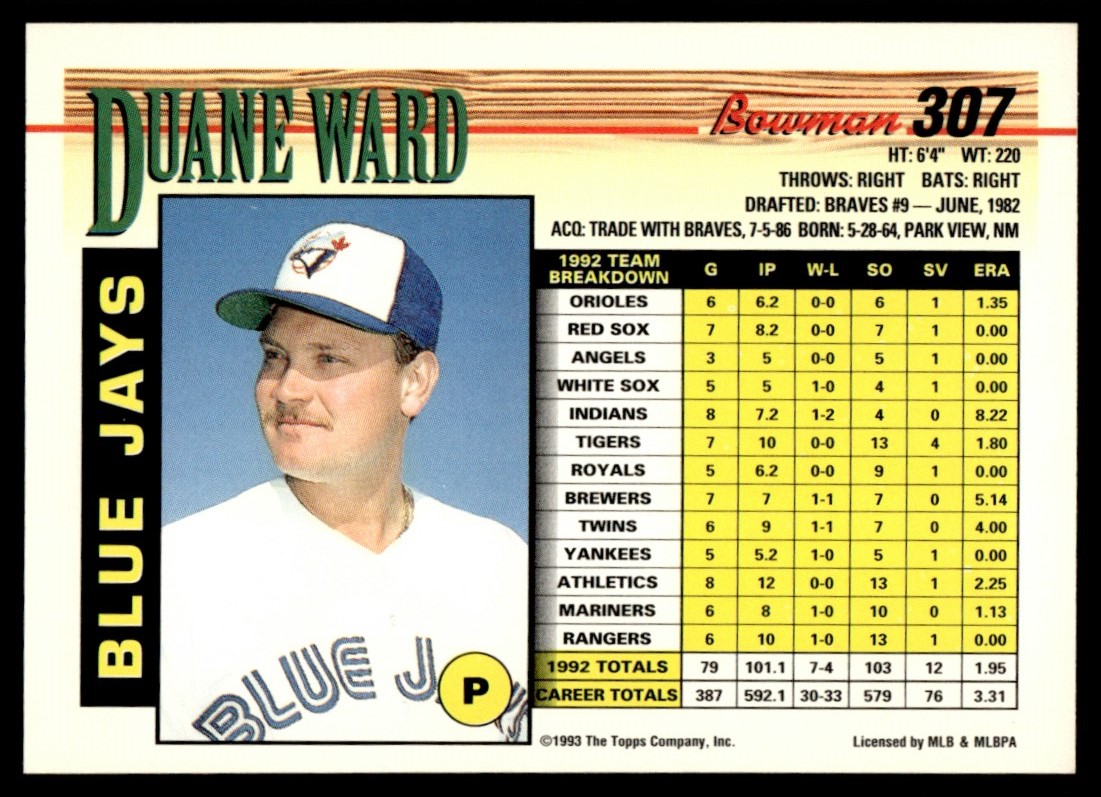 | 1993 Bowman #307 Duane Ward Toronto Blue Jays |