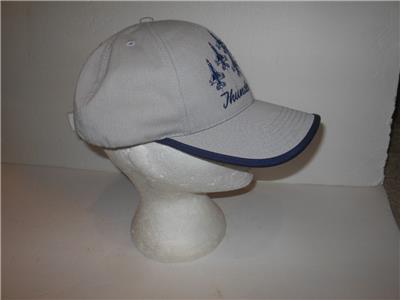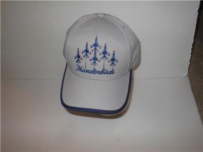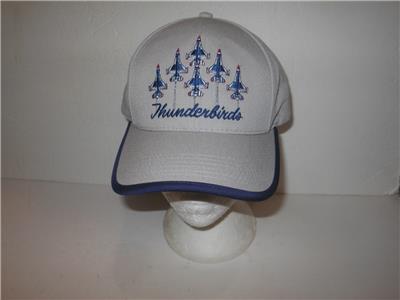 FRONT CENTER SHOWS OFFICIAL LOGO OF 6 AIRCRAFT / FIGHTER JETS & STATES THUNDERBIRDS EMBROIDERED IN OFFICIAL COLORS OF BLUE, GRAY & RED. THE VISOR / BILL IS GRAY W/ BLUE ACCENT.
