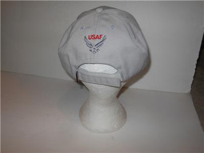 BACK HAS PANELS, OFFICIAL LOGO STATES USAF EMBROIDERED IN GRAY & RED, AMERICAN FLAG IN OFFICIAL COLORS HAND SEWN & VELCRO ADJUSTABLE PIECE