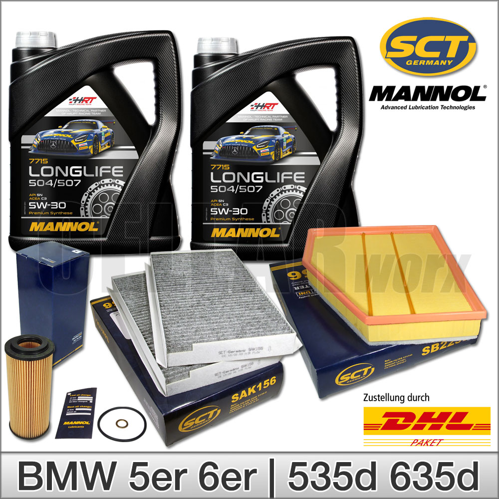 Inspektionskit für BMW 5er E61 E61 535d 6er E63 E64 635d Lieferumfang: Innenraumfilterset / Pollenfilter (SCT-Germany) • 2 Filter im Originalkarton Motor-Luftfilter (SCT-Germany) • tadellos verarbeitet Ölfilter (Topran-Germany) • hochwertiger Ölfilter 10 Liter MANNOL 7715 Longlife 504/507 API SN Entspricht folgenden Freigaben / Spezifikationen / Produkten: SAE 5W-30 API SN ACEA C3 MB 229.51 VOLKSWAGEN 504.00 VOLKSWAGEN 507.00 VOLKSWAGEN TL 52 195 BMW Longlife-04 PORSCHE C30 Universelles Premium-Synthese-Motorenöl für moderne Benzin- und Dieselmotoren von Fahrzeugen der VW-Gruppe (einschließlich Direkteinspritzung) mit und ohne Turboaufladung, einschließlich Fahrzeugen mit Pumpe-Düse-Einspritzung. Produkteigenschaften: - Aufgrund der enthaltenen speziellen Reibungsmodifikatoren verfügt es über ausgezeichnete Anti-Verschleiß-, Extremdruck- und Antifriktionseigenschaften, was einen langen und störungsfreien Betrieb des Pumpe-Düse-Systems und der gesamten Kraftstoffzuführung gewährleistet und den Verschleiß der Nocken reduziert; - Aufgrund seiner hervorragenden reinigenden und dispergierenden Eigenschaften und seiner hohen thermisch-oxidativen Stabilität wirkt es effektiv gegen alle Arten von Ablagerungen und hält Motorteile während des gesamten Austauschintervalls sauber; - Spart Kraftstoff durch optimale Reibungseigenschaften; - Das synthetische Basisöl sorgt für eine niedrige Erstarrungstemperatur (-45° C und darunter) und garantiert ein leichtes Anlassen des Motors bei niedrigen Temperaturen dank der außergewöhnlichen Dreh- und Pumpfähigkeit, wodurch der Verschleiß beim Anlassen des Motors erheblich reduziert wird. - Es bietet eine optimale Viskosität über einen weiten Temperaturbereich, was einen stabilen Betrieb in allen Betriebssituationen gewährleistet, auch im Stadtverkehr und unter Überlastbedingungen; - Aufgrund seiner hohen thermisch-oxidativen Stabilität ist es alterungsbeständig; - Kompatibel mit allen Abgasneutralisationssystemen, DPF, tWC, AGR und SCR durch den Einsatz der Mid SAPS-Technologie; - Verwendet in Motoren mit verlängerten Ölwechselintervallen (Long Life bis zu 30.000 km) und konventionellen Motoren; - Geeignet für Motoren, die mit Flüssigerdgas (LNG) und Flüssiggas (LPG) betrieben werden. Konzipiert für Benzin- und Dieselmotoren der Emissionsklassen EURO IV und EURO V (PKW, leichte SUV, Lieferwagen und leichte LKW) von VW. Erfüllt zusätzliche Anforderungen an Motoröle gemäß den Spezifikationen 504.00/507.00 und früher. Altölverordnung: Gemäß der Altölverordnung sind wir verpflichtet, folgende gebrauchte Öle kostenlos zurückzunehmen: -- Vebrennungsmotorenöle -- Getriebeöle -- Ölfilter und beim Ölwechsel regelmäßig anfallende ölhaltige Abfälle. Sie können das Altöl in der Menge bei uns zurückgeben, welche der bei uns gekauften Menge entspricht. Unsere Annahmestelle ist: CELLARworx Cornelia Frings Werderstr. 40 42655 Solingen Öffnungszeiten: Mo. - Fr. 10 - 17 Uhr Sie können die Öle dort jederzeit während der Öffnungszeiten abgeben. Alternativ können Sie das gebrauchte Öl auch an unsere Annahmestelle senden, wobei die Versandkosten hierbei von Ihnen zu tragen sind. Bitte beachten Sie, dass für Altöl besondere Transportbedingungen gelten können. Unsere Annahmestelle verfügt über einen Servicepartner, der es ermöglicht, den Ölwechsel fachgerecht durchzuführen. Falls Sie ein gewerblicher Endverbraucher sind, weisen wir darauf hin, dass wir uns Ihnen gegenüber zur Erfüllung unserer Annahmepflichten Dritter bedienen können.