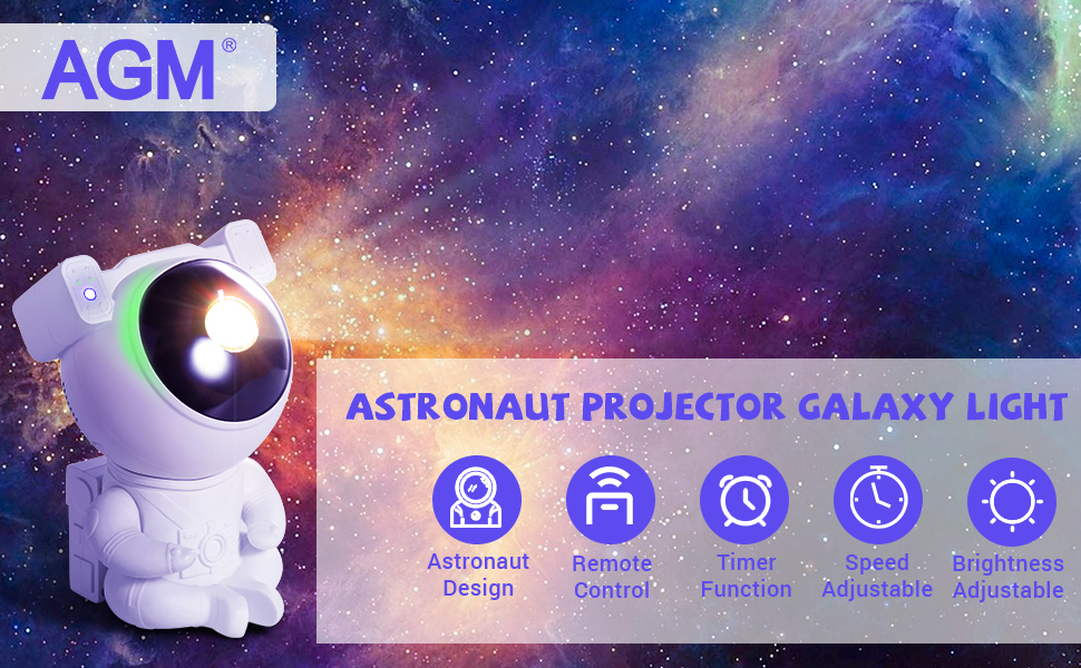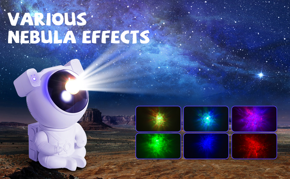 【Manual Switch, Remote Controller & Timer】: You have 2 ways to turon on Astronaut Light Projector: the back buttons & the remote control. The button on the back can only turn on the projector, Nebula & star switch, and long press to turn it off; The remote control can adjust colors, speed, and brightnesses of nebula & star, as well as timer switch(45 minute or 90 minute automatically turn off).