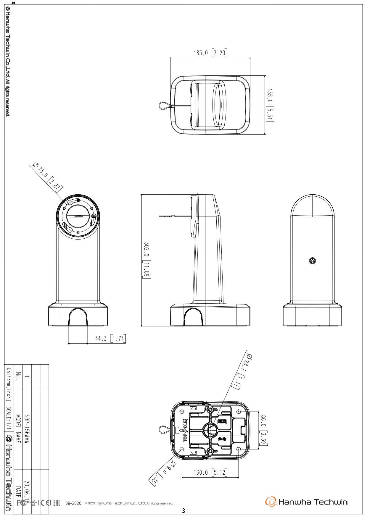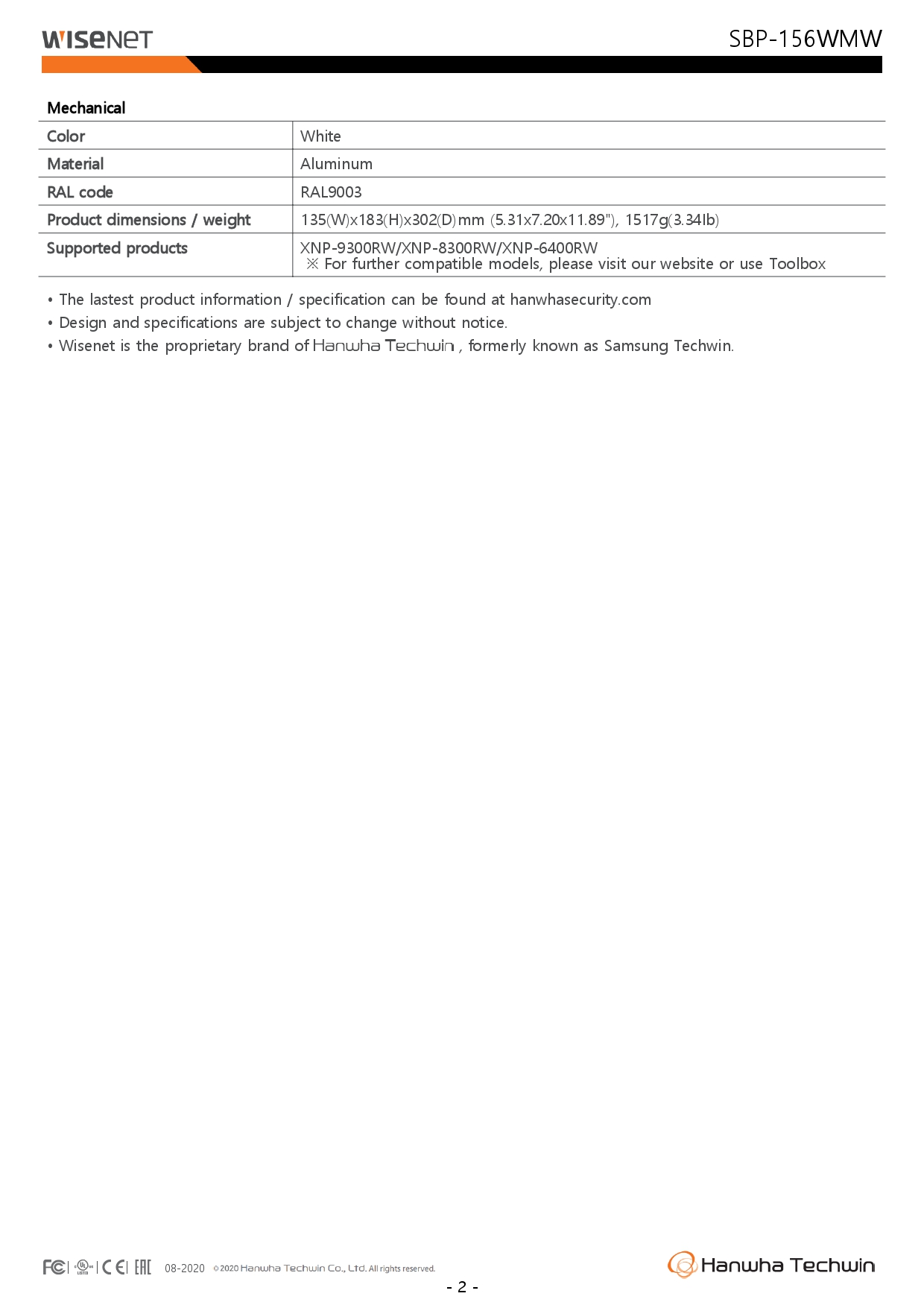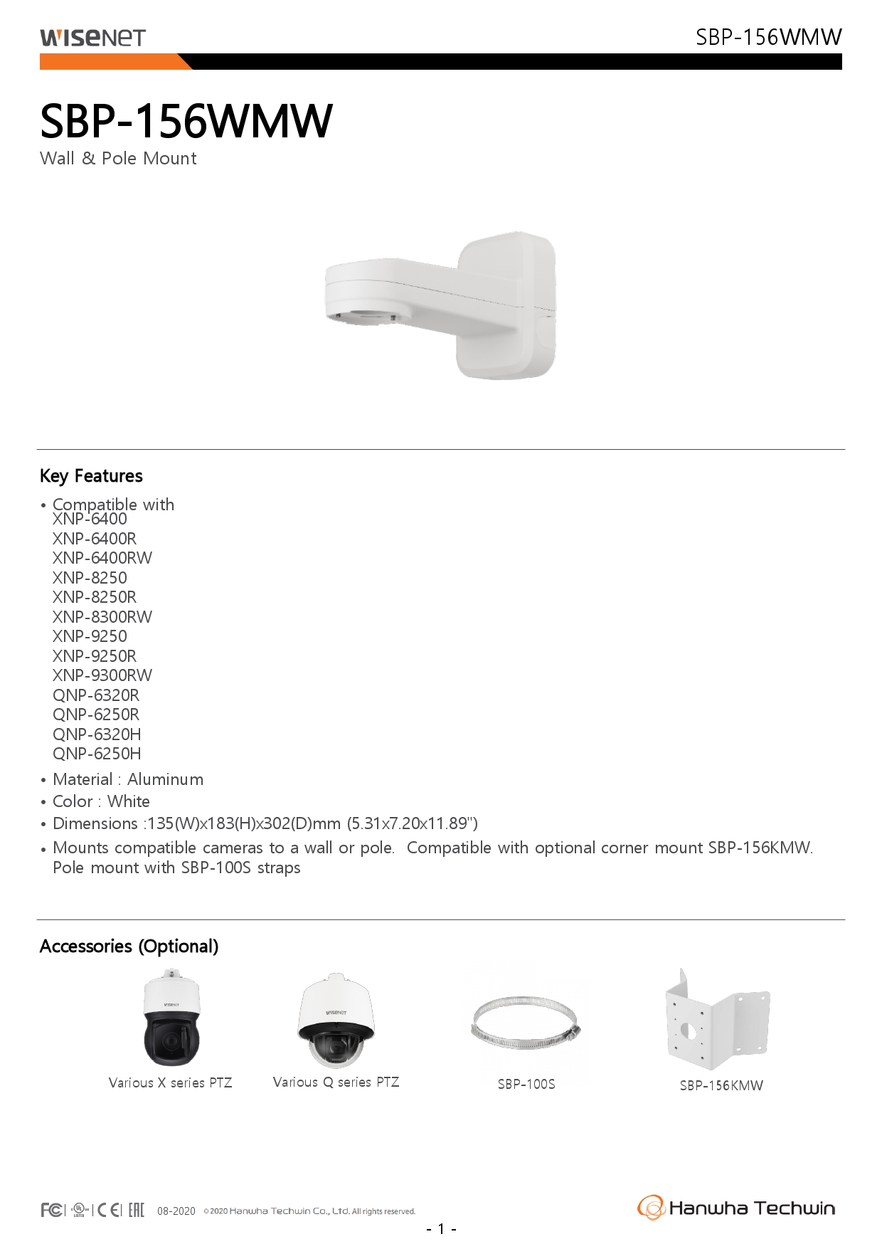 The white SBP-156HMW from Hanwha Techwin is a hanging mount that is designed to be used with Wisenet PTZ Plus cameras, including the XNP-9300RW, XNP-8300RW, and XNP-6400RW. Hanging mount, Material : Aluminum, Color : White, Dimensions : ?95.5x77.0 mm( ?3.76x3.03"), Compatible with: XNP-9300RW/8300RW/6400RW