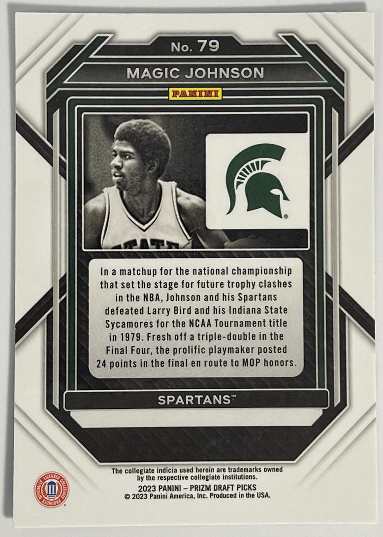 | Description: | Magic Johnson | | Category: | Basketball | | Year: | 2023 | | Product: | Panini Prizm Draft Picks | | Team: | Michigan State Spartans | | Card Number: | 79 | | Dimensions: | 3½" x 2½" | | SKU: | BK B0019 R05 A (148) |