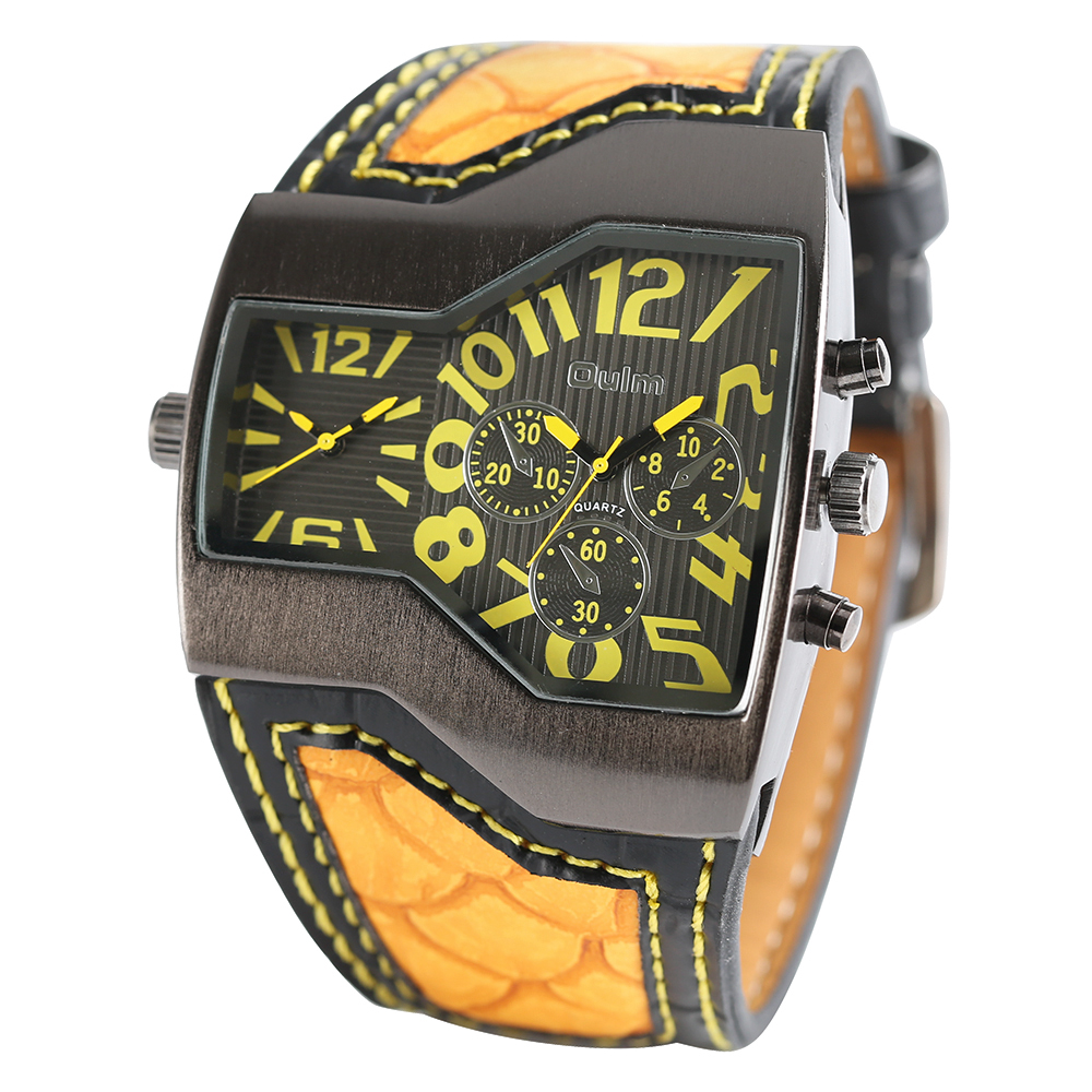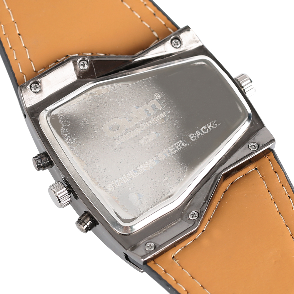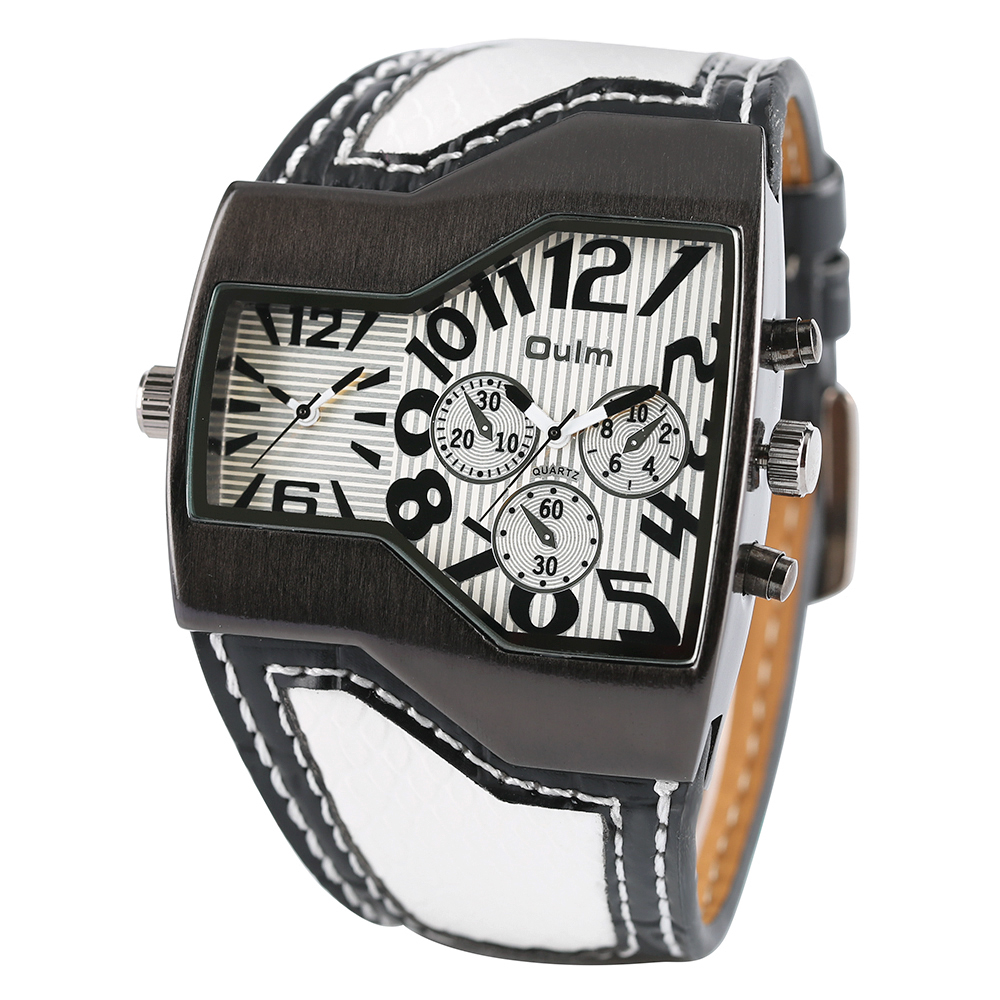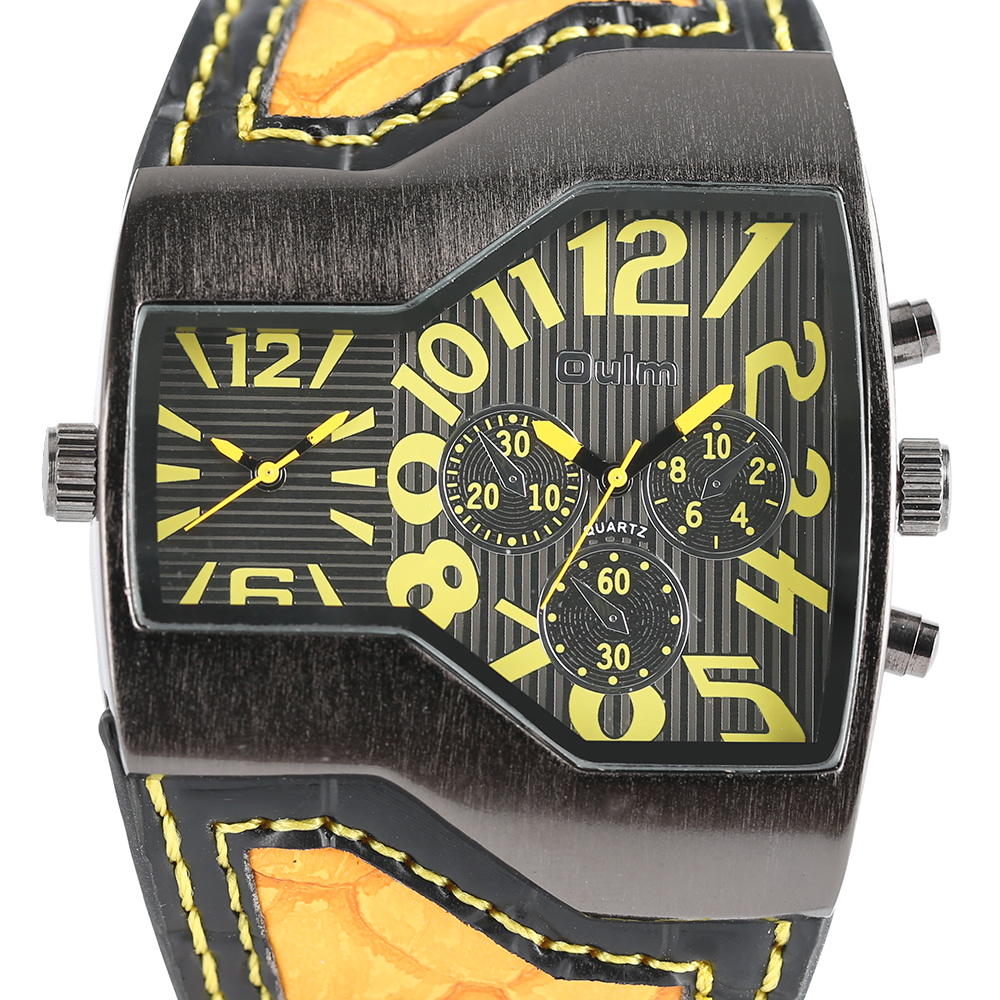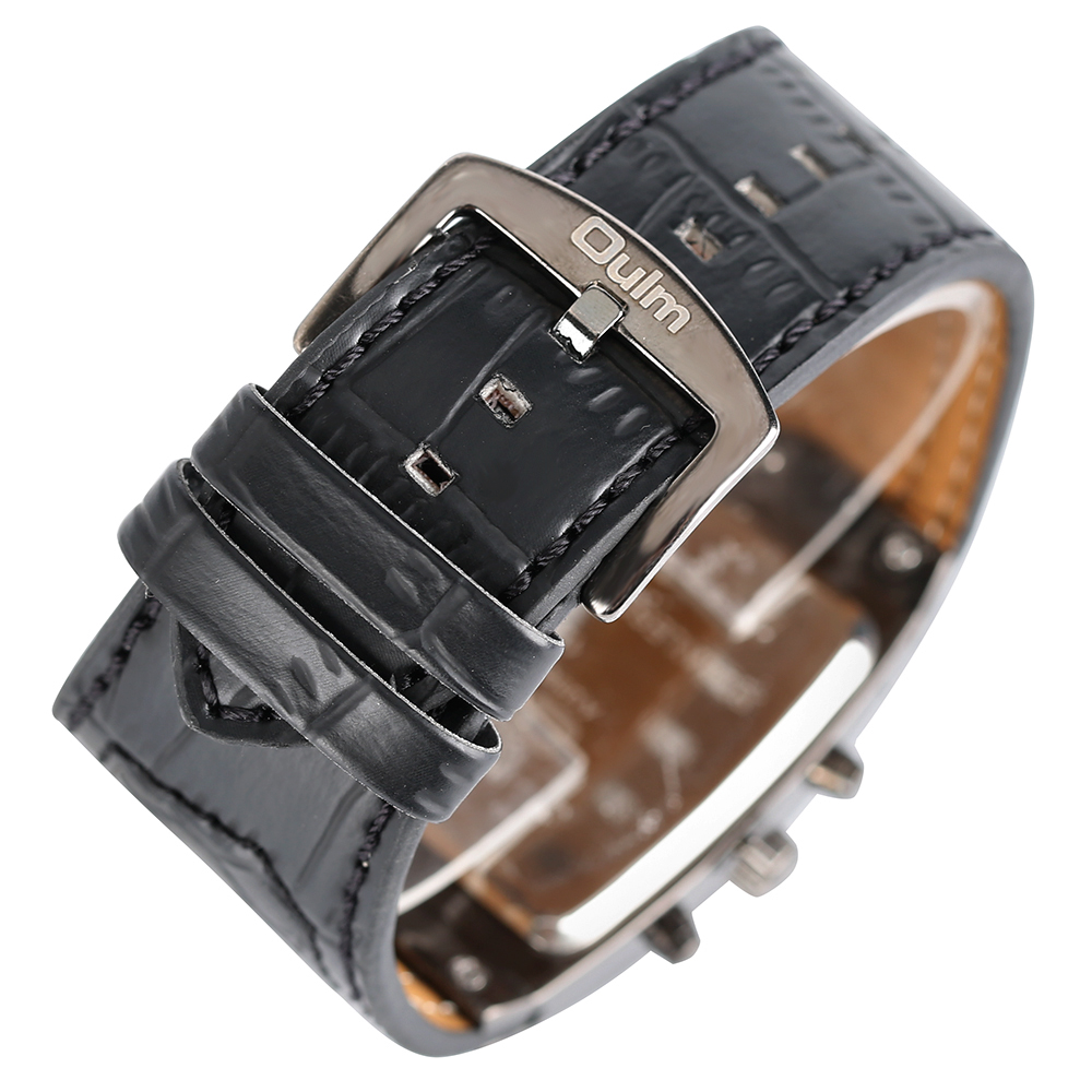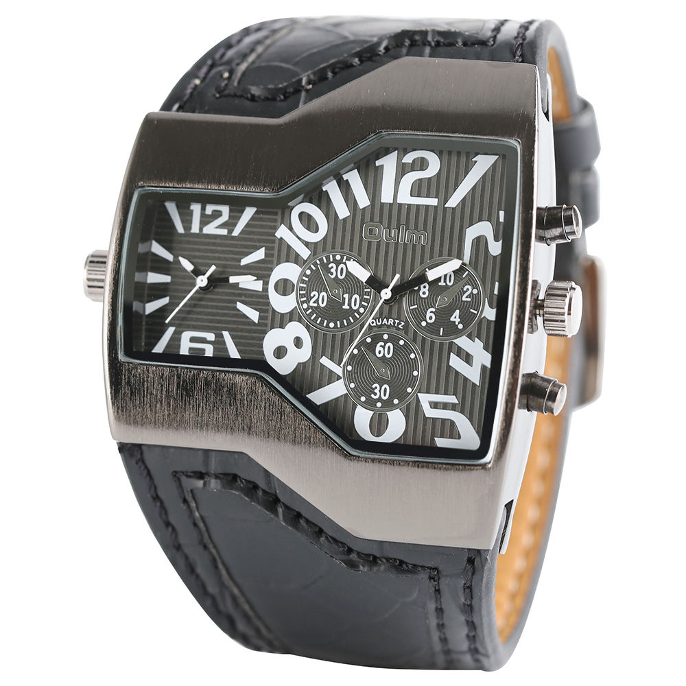 Product Features: 100% Band New and High Quality Two Time Zone Movement Brand: OULM Movement: Quartz Dial Window Material: Glass Buckle Type: Pin Buckle Case Material: Stainless Steel Band Material: Leather Case Size: Approx.5.3*4.8 cm Case Thickness: Approx.1.3 cm Watch Strap Width: Approx.4.2 cm Watch Strap Length: Approx.23.5 cm (Including Case ) (2.54cm=1.00 inch) Note: The sub-dials just decorations,no function.