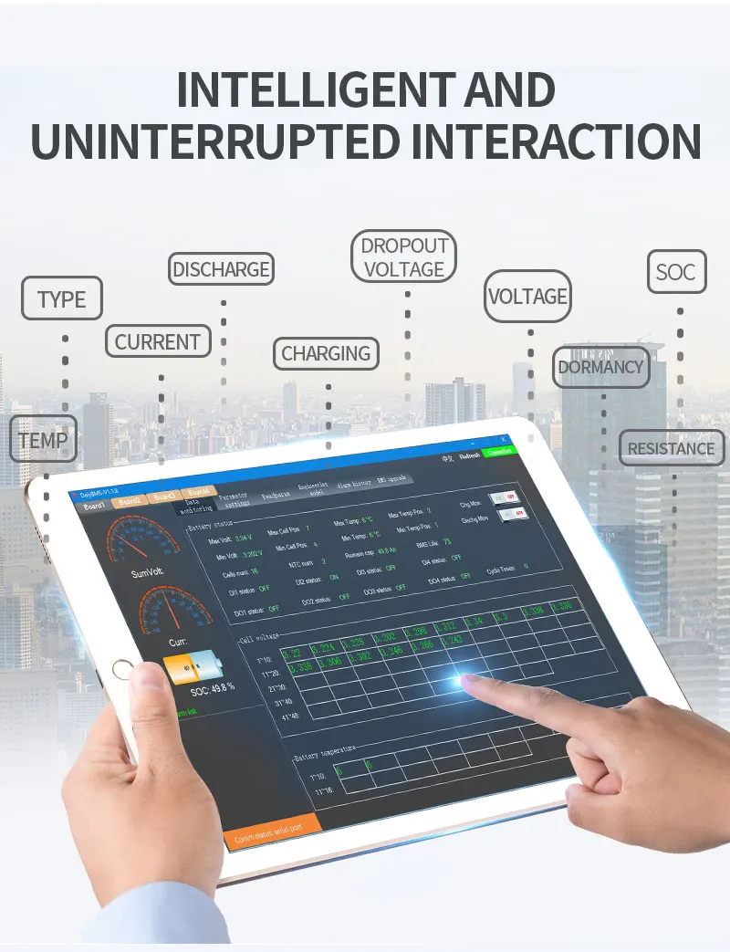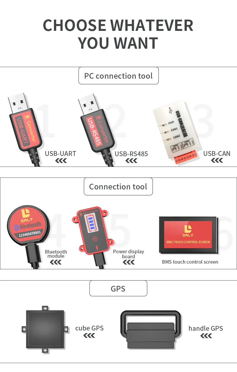Daly 18650 smart BMS 13S 48V 30A 40A 60A Bluetooth 485 to USB device NTC UART software togther Lion LiFepo4 Battery BMS ◆ Currently, all Smart BMS without the waterproof function. ◆ This link is for 13S 48V Li ion Battery. Please fill in the parameter after placing order to ensure SOC with right information. At least the AH must be sent to us by Aliexpress message center. Thanks. Feature ◆ UART : It is Daly normal product. UART is Universal Asynchronous Receiver/Transmitter, It transforms the data to be transmitted between serial communication and parallel communication. As a chip to convert parallel input signals into serial output signals, UART is usually integrated into other communication interfaces. ◆ RS485: Please choose the model RS485 of Daly. RS-485 adopts balanced transmission and differential reception, so it has the ability to suppress common mode interference. ◆ Bluetooth module : if you need this function, Please choose bluetooth module, if you do not buy it, we will not send it to you. ◆ Below accessary need you to buy separately. 1.USB to UART Cable 2.USB to RS485 Cable 3. Bluetooth module 4.Power display panel (key activation) 5.BMS touch control screen 1. DL13S 48V Smart BMS 30A 40A 60A bms can be used to 13S Li ion or LiFePO4 or LTO battery pack. Customer can adjust the paramter of overcharge or overdischarge the parameter sitting & other parameter if customer need to use which type battery for the same series battery. Attention: Customer need to identify the battery's series, then choose the same series BMS. Such as your battery is 24S, you must choose 24S BMS, can not choose 20 or other one. The number of series of BMS is fixed ,not adjustable once the BMS is shipped out . ◆Control instructions: remote control device monitoring. ◆Vehicle icon: data transmission send command ◆Statistical report: Collect the data information, the customer can monitor the battery capacity & other alarm infomation. ◆Electronic fence: fence setting limit range. ◆Device information: device parameter information, etc. The information on your battery can be checked on your host computer, then you can monitor your battery status anytime. Which is easly control your device. Smart BMS make our life to become easy.