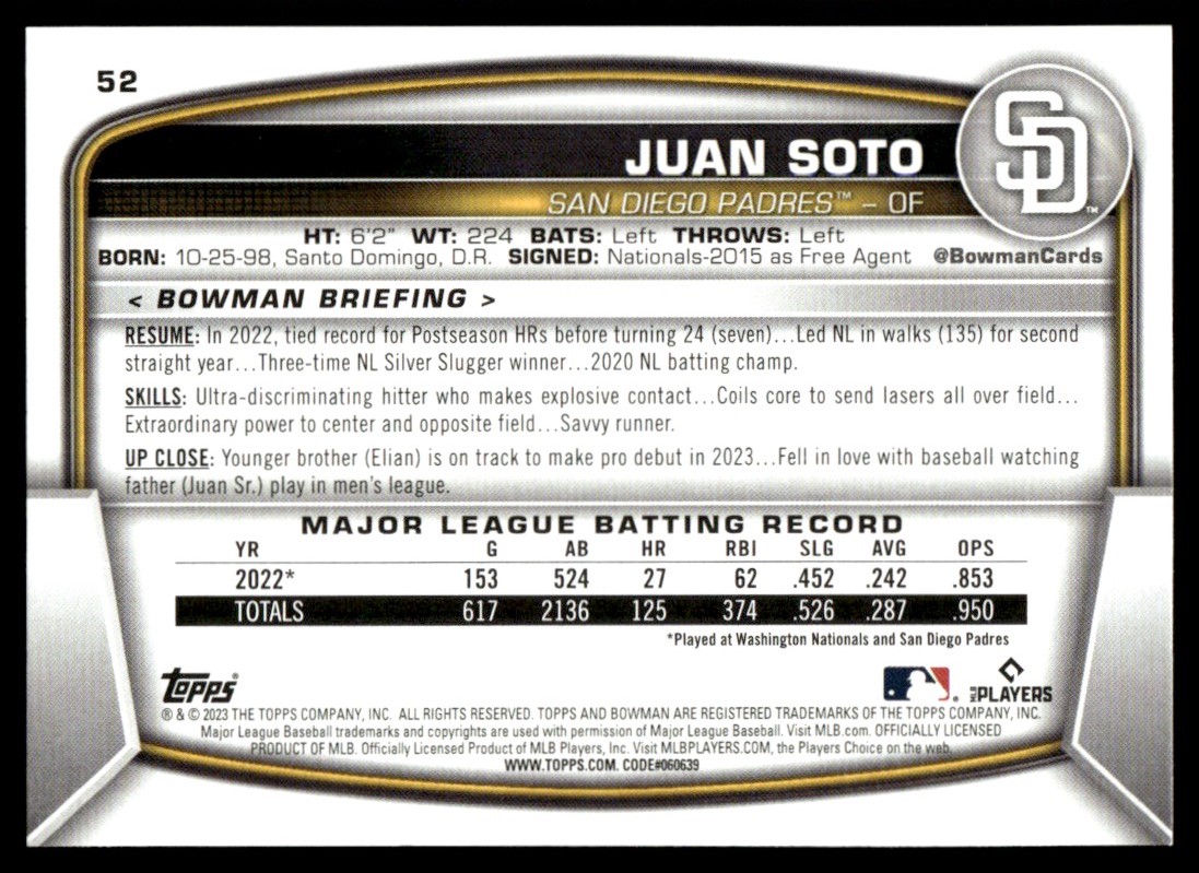 | 2023 Bowman #52 Juan Soto San Diego Padres |