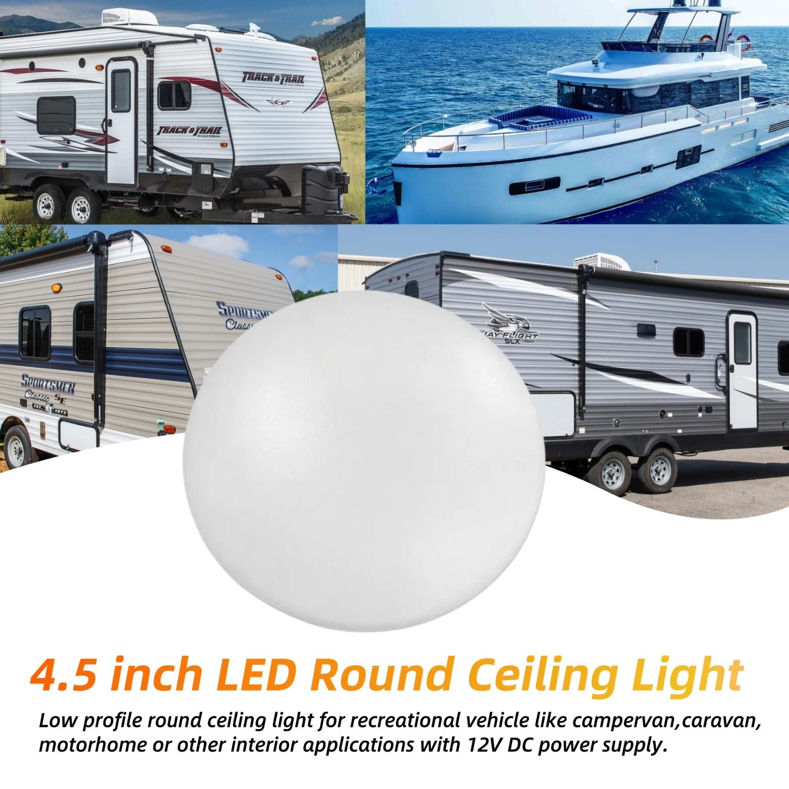 This 4.5" LED mushroom light has a large of applications, such as RV under cabinet down light, mini-motor-home, interior dome light, interior cabin dome light, automotive dome light applications, etc. This elegant light applies directly to the RV 12V DC input voltage. Its twist-off lens is an industry first. Installation is quick and easy!