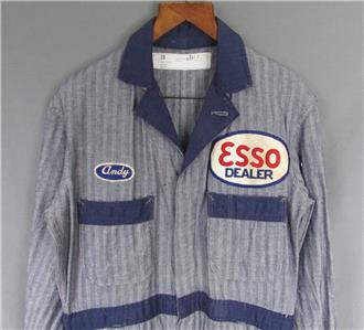 Large oval, 'Esso Dealer' Gasoline patch above left chest pocket.