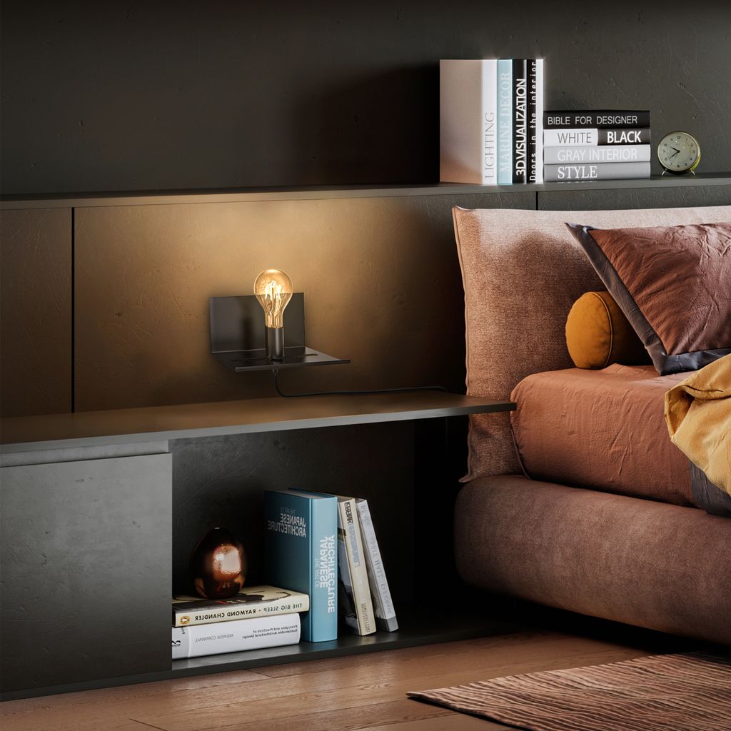 Wandleuchte 1-flammig mit Ablage - Matt-Schwarz - exkl. 1 x E27 max. 10W ohne Leuchtmittel - Fassung verschiebbar - 180cm Kabel mit Schalter - 250x115x120mm (LxBxH)