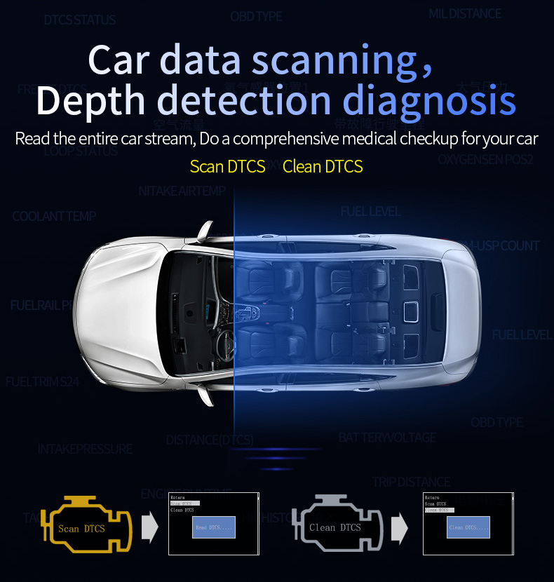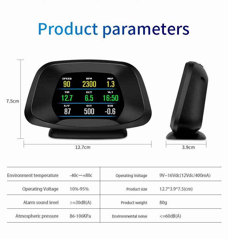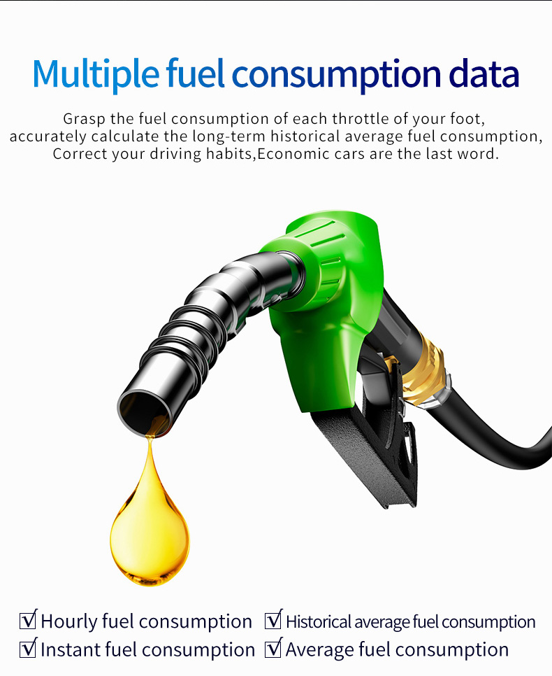 This product connects car OBD2 interface by OBD cable, and display the driving dates, e.g. vehicle speed, engine RPM, water temperature, fuel consumption,voltage etc. It can keep the driver’s eyes always on road to avoid the dangerous of lowering down head to read the dashboard. This product won’t change any car ECU dates.