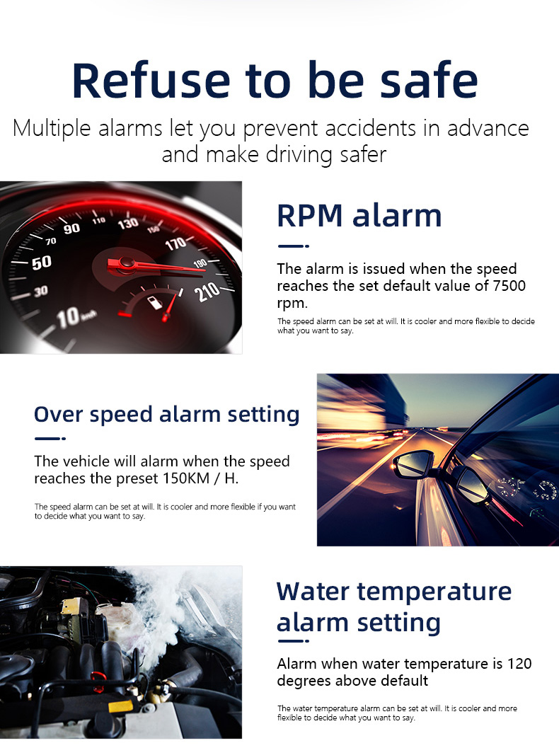 9. Display information: Speed, engine RPM,water temperature, driving distance,battery voltage....