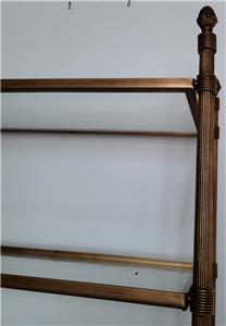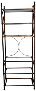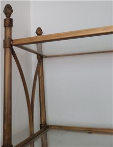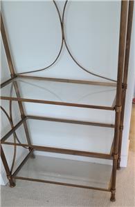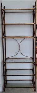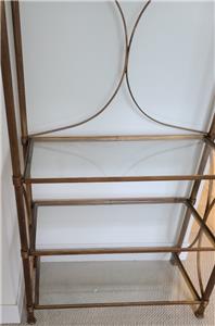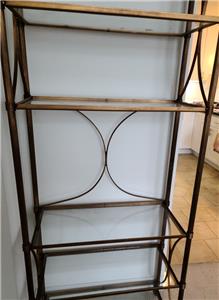 Offered here is this Beautiful Metal Etagere Shelf with Glass Shelves. It has a very nice, stylish design, and is in very good condition, with the glass shelves intact with no chips or cracks. I am unsure of the age or manufacture of the shelf. It is copper in color, and the glass shelves are clear glass. The shelf posts have a reeded design that gives the shelving unit a wonderful stylish appeal. There are six (6) shelves in the unit. The unit is 80” tall, with the top shelf sitting at 75.5” high, the next shelf down is at 63.5” high, the next is at 51 5” high, the next is at 28” high, the next is at 16.5” high, and the bottom shelf is at 4.5” high. The unit is 30.5” long side to side, and 14” wide front to back. It is a very nice, stylish Etagere Shelf with plenty of space to display your treasured items and books.