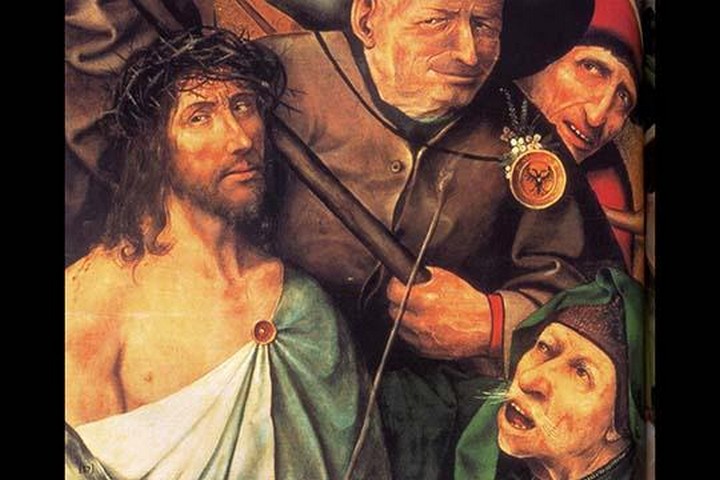 Christ Crowned with Thorns, attributed to a follower of Hieronymus Bosch, is an oil-on-panel painting from the early 16th century, likely created between 1510 and 1535. Housed in the Museum of Fine Arts in Ghent, Belgium, this artwork combines two pivotal events from the Biblical account of Jesus's Passion: the Mocking of Jesus and the Crowning with Thorns. In the composition, a serene Jesus, dressed in white, stands at the center of a bustling scene. His calm gaze contrasts sharply with the violent intent of the four men surrounding him. Two armored soldiers loom above and behind, while two other spectators kneel below and in front. The soldier on the right, with oak leaves in his hat, grasps Christ's shoulder, while the left soldier, dressed in green, holds the crown of thorns, poised to thrust it onto Jesus's head. The position of the thorns creates a halo above Christ. The figures are crowded together in a single plane, reminiscent of Flemish devotional art popularized by artists like Hans Memling and Hugo van der Goes. Notably, the painting uses caricature to provide grotesque-looking faces surrounding Jesus, emphasizing the emotional intensity of the scene. The work's enigmatic expressions and meticulous details invite contemplation of Christ's suffering and sacrifice, transcending time and faiths.