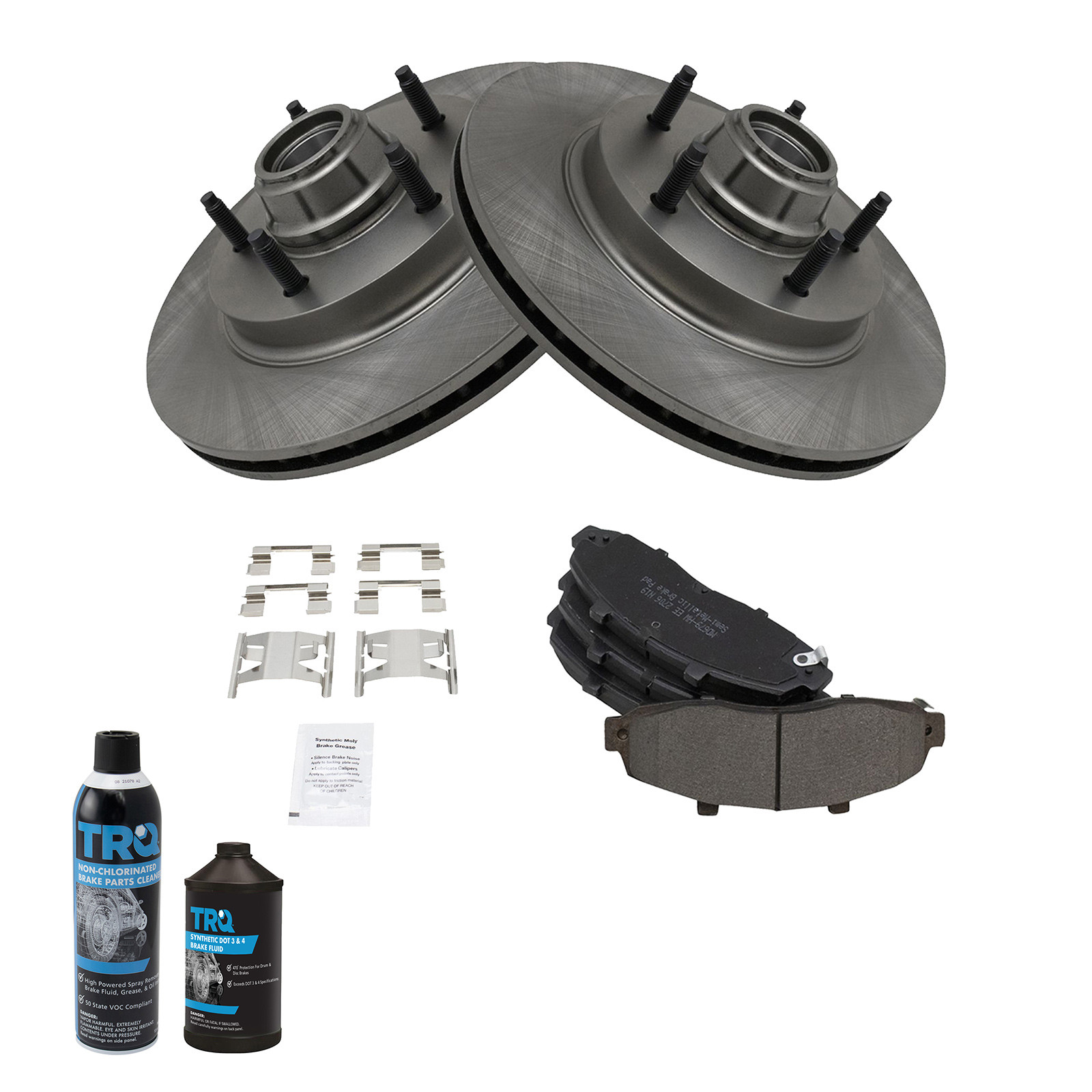 Kit Includes:(1) 12 oz DOT 3 & 4 Brake Fluid, Kit Includes:(1) 13 oz Non-Chlorinated 50 State Formula Brake Cleaner, Kit Includes:(1) Front Semi-Metallic Brake Pad Set with Contact Point Grease & Hardware, Kit Includes:(2) Front Brake Rotors