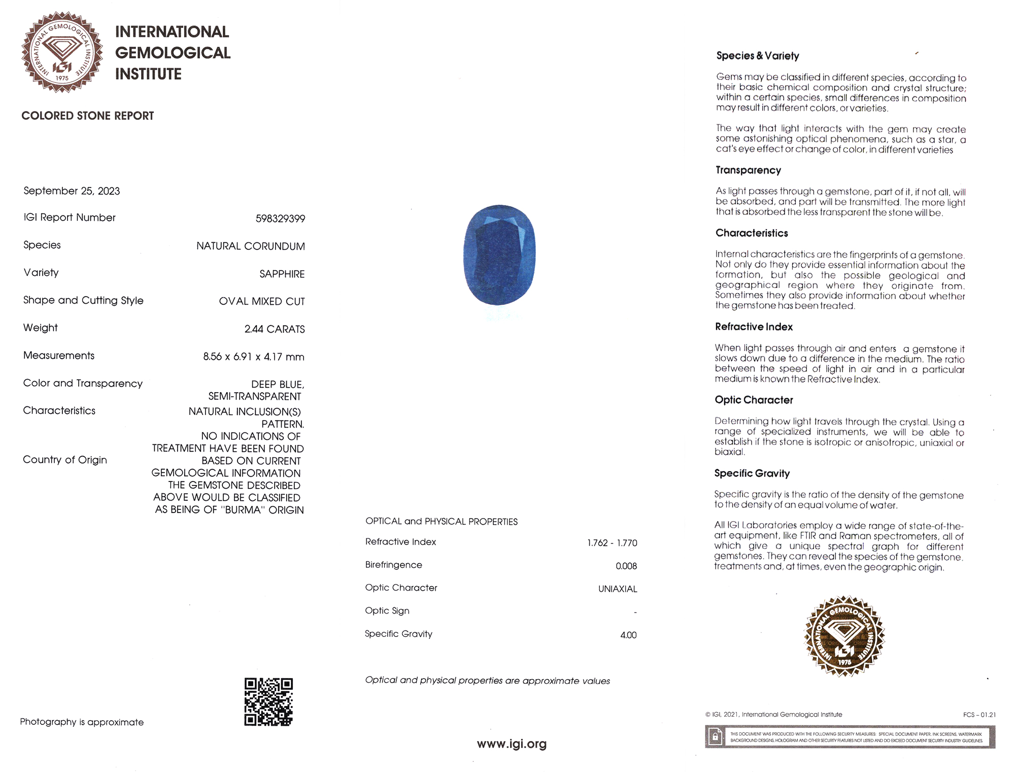 International Gemological Institute report # 598329399