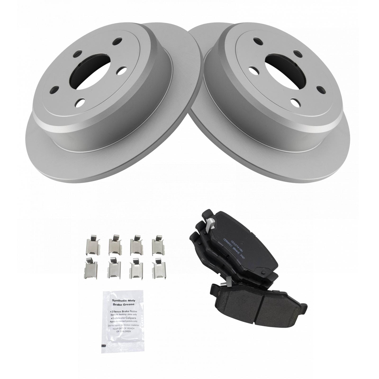Kit Includes:(1) Rear Ceramic Brake Pad Set with Contact Point Grease & Hardware, Kit Includes:(2) Rear G-Coated Brake Rotors