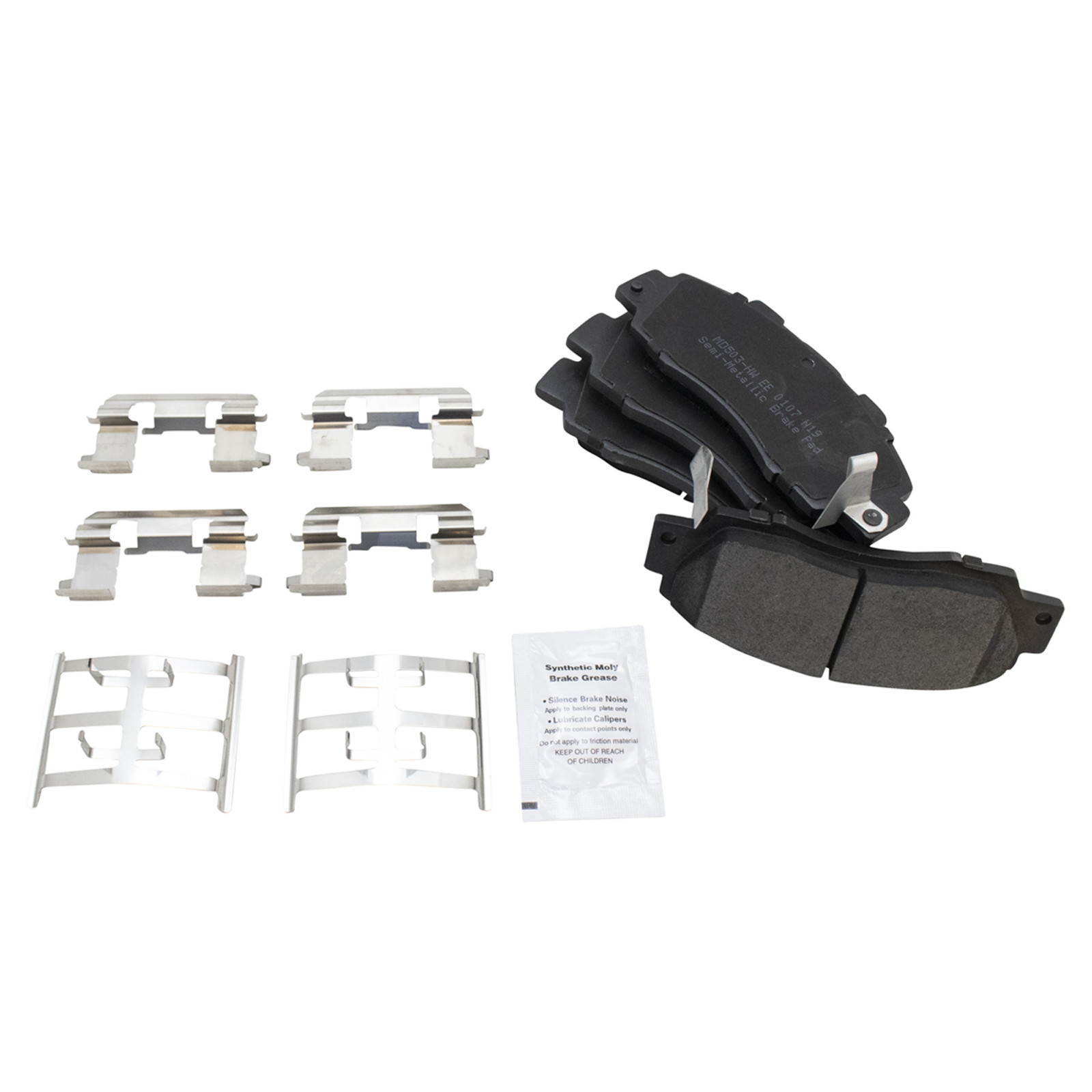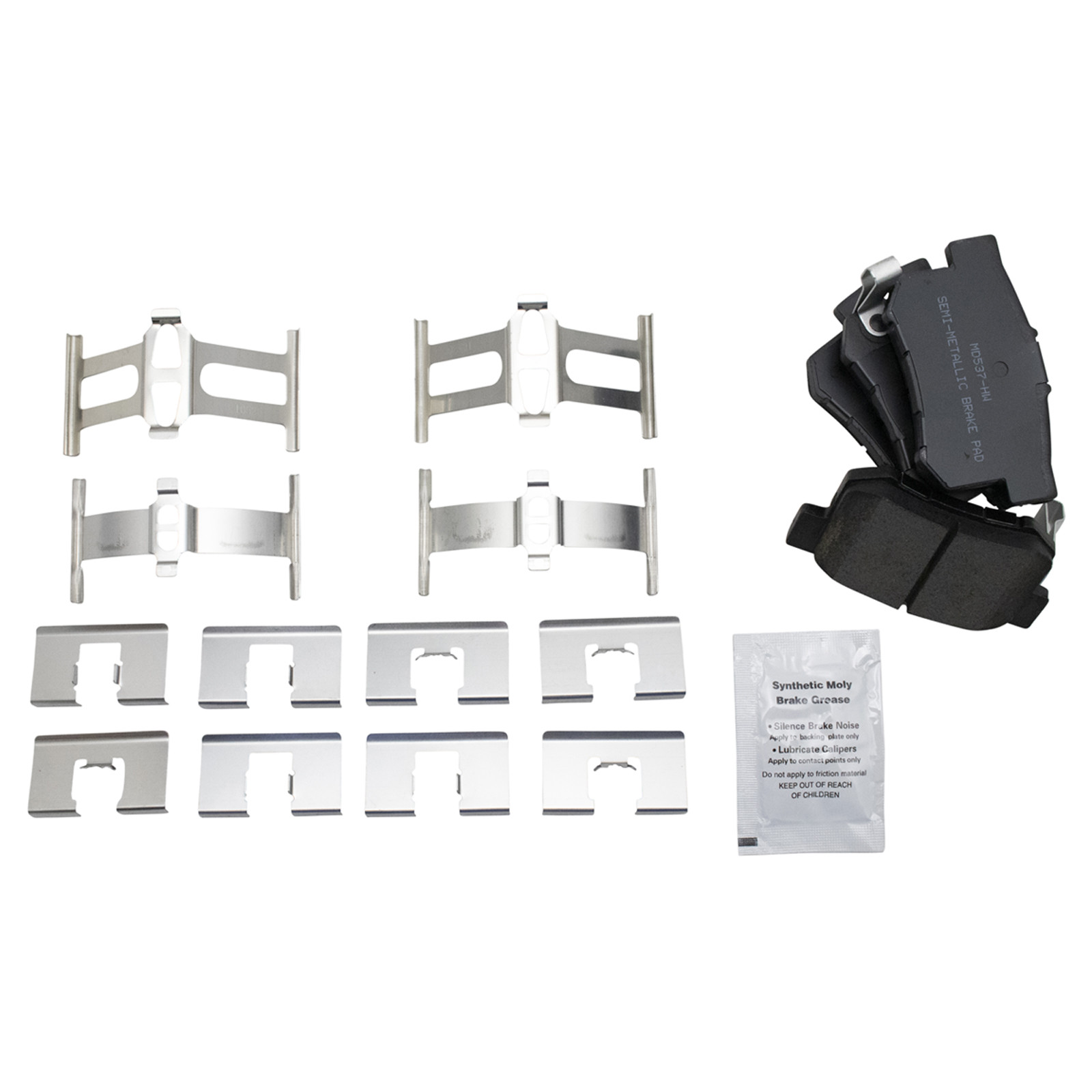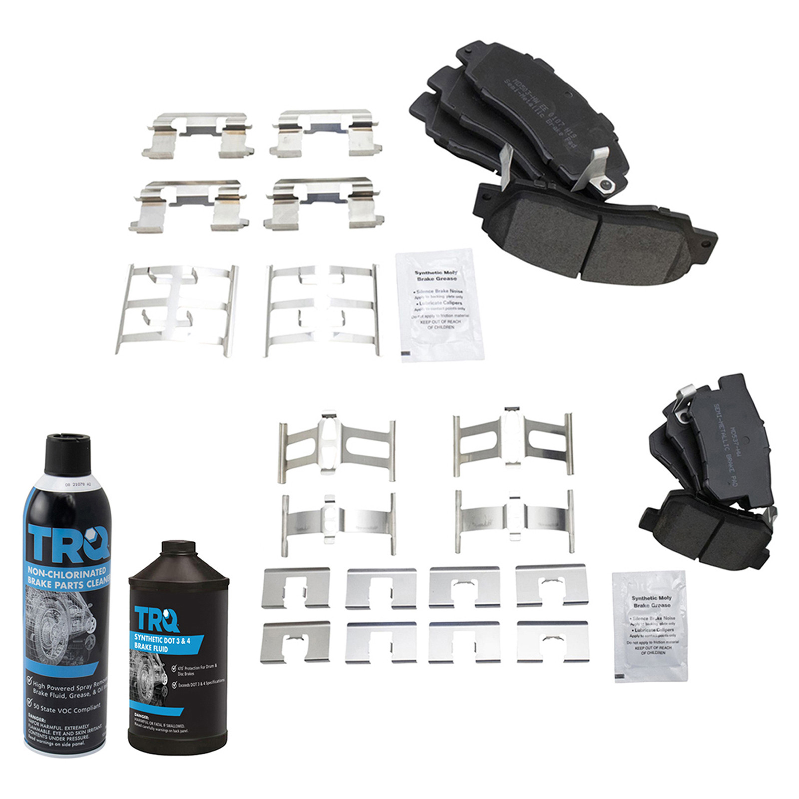 Kit Includes:(1) 12 oz DOT 3 & 4 Brake Fluid, Kit Includes:(1) 13 oz Non-Chlorinated 50 State Formula Brake Cleaner, Kit Includes:(1) Front Semi-Metallic Brake Pad Set with Contact Point Grease & Hardware, Kit Includes:(1) Rear Semi-Metallic Brake Pad Set with Contact Point Grease & Hardware
