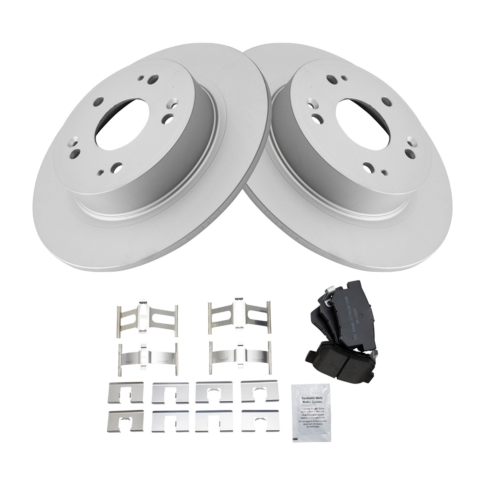 Kit Includes:(1) Rear Semi-Metallic Brake Pad Set with Contact Point Grease & Hardware, Kit Includes:(2) Rear G-Coated Brake Rotors