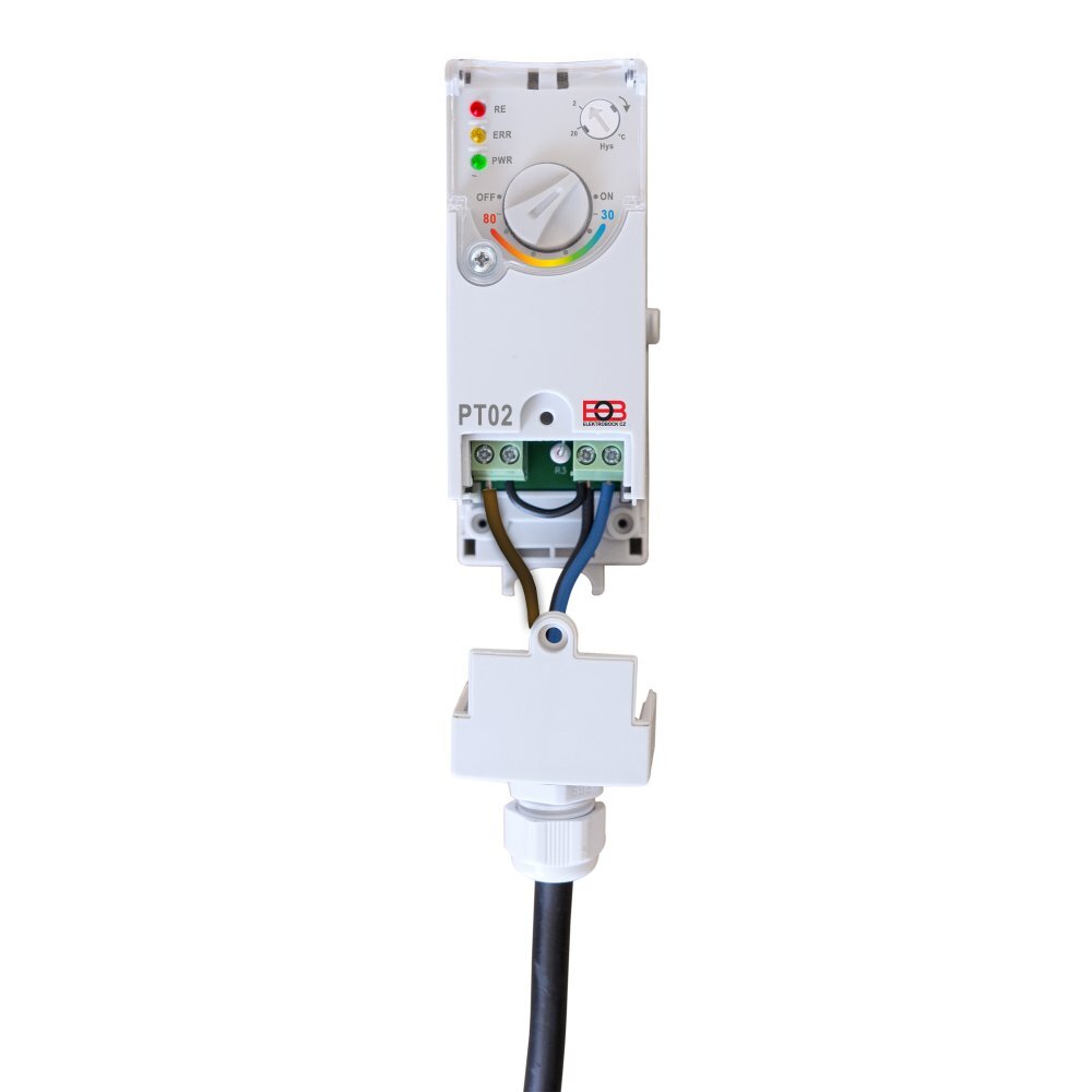 Le thermostat PT02 est un appareil électronique conçu pour activer automatiquement les pompes de circulation. Cette activation s'effectue sur la base d'une température prédéterminée et d'une soi-disant hystérésis, c'est-à-dire sur une plage de température définie. Si cette température ou Lorsque cette plage de température est atteinte, le thermostat met en marche la pompe.