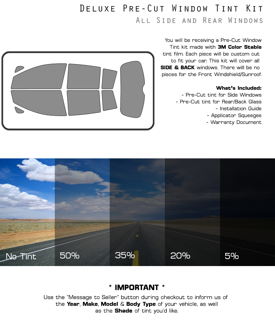 A: This is a PreCut window tint kit made using 3M COLOR STABLE window tint film. The product will be PreCut for your specific vehicle and will cover all side and rear windows.