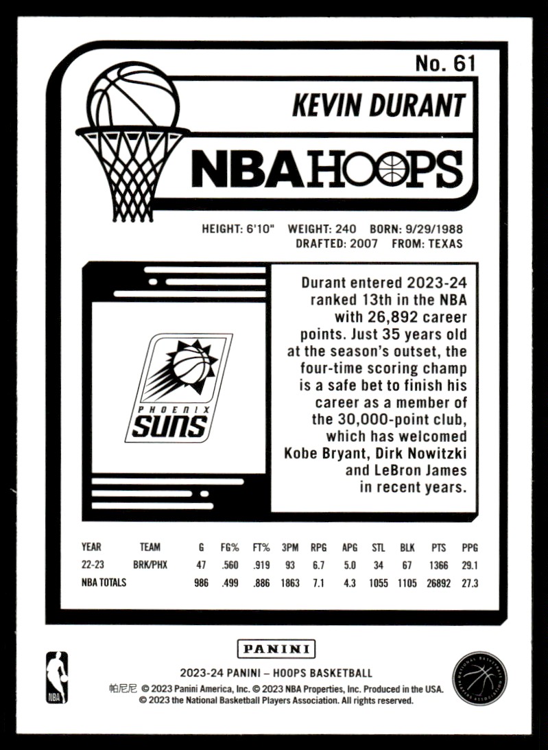 | 2023-24 Hoops Blue #61 Kevin Durant Phoenix Suns |
