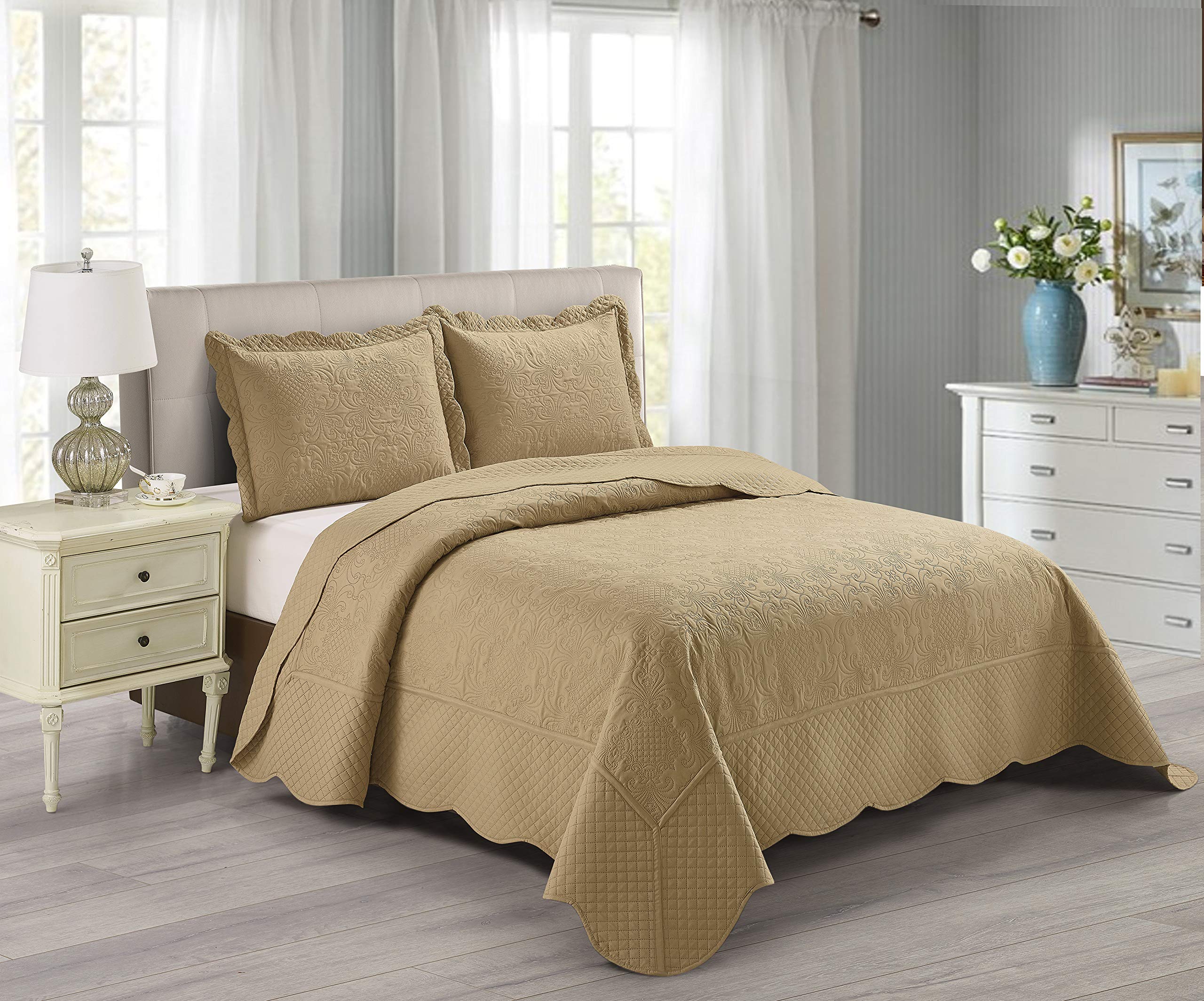 Better Home Style 3 Piece Luxury Ultrasonic Embossed Solid Quilt Coverlet Bedspread Oversized Bed Cover Set # Veronica (Full/Queen, Taupe)