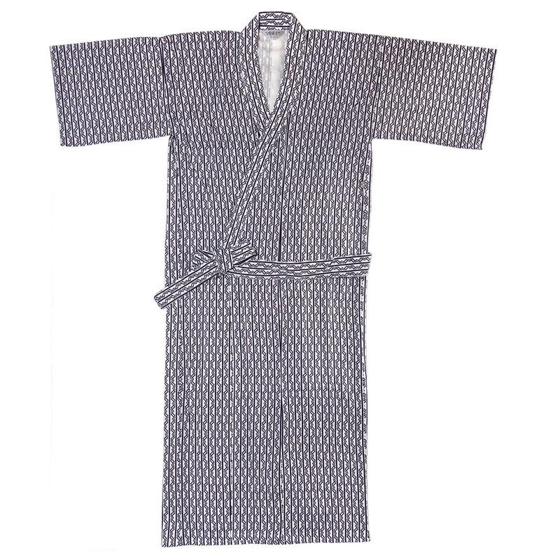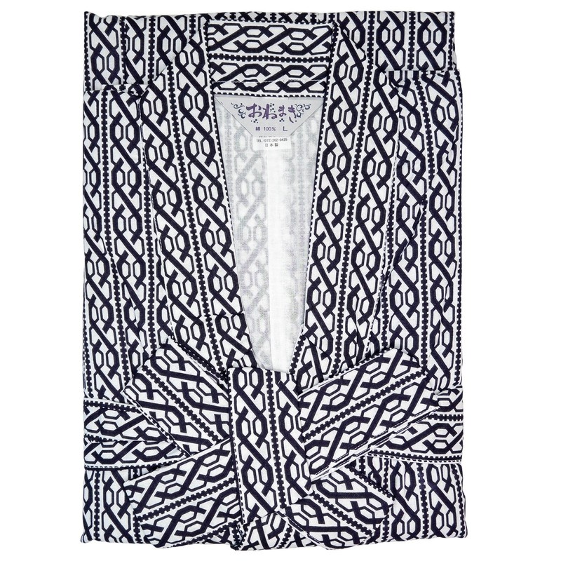This is a medium weight cotton nemaki of the type used by guests in Japanese inns, hotels and hot spring resorts for all seasons. It is lined in gauze in a traditional unisex geometric pattern and includes the matching belt. They wrap and tie with the belt at the waist like a bathrobe. In Japan, hotel guests sleep in them but also wear them around the hotel and even in the streets of Onsen hot spring resort towns. They are 100% cotton and can be machine washed and dried.
