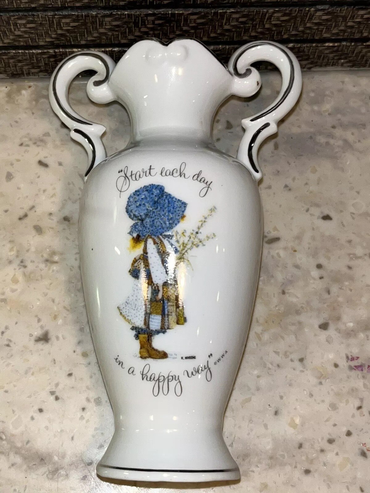 Add a touch of vintage charm to any room with this lovely Holly Hobby porcelain bud vase. Made in Japan in 1972 by World Wide Arts, Inc, this licensed reproduction features a glazed finish and gold trimmed details. The vase stands at 6 inches tall and is suitable for any occasion, making it a perfect addition to your decorative collectibles.