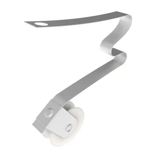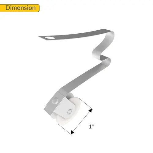 The Brixwell patio screen door roller assembly is intended for use in sliding screen doors that rely on guided rolling action. This assembly features a 1" diameter nylon wheel with a 17/64" wheel width, compatible with various standard screen doors. The white finish aligns with lighter door frames, and the 2-1/2" arm extends reach during installation. It includes an M-type spring that maintains tension during door travel. The mounting hole measures 11/32" in diameter, fitting within several frame setups. Configured for replacement or incorporation in constructed units, the roller assembly assists in screen door tracking with reduced contact force. It allows directional alignment, contributing to panel placement and lowering track resistance. The nylon wheel structure supports regular motion across screen door rails. Suitable for frame arrangements in indoor or protected exterior openings where 1" rollers are required. This component aligns with sash or guide systems where rolling parts are utilized in framed assemblies or panel movement guides. Steel spring material supports consistent tension and mechanical function.