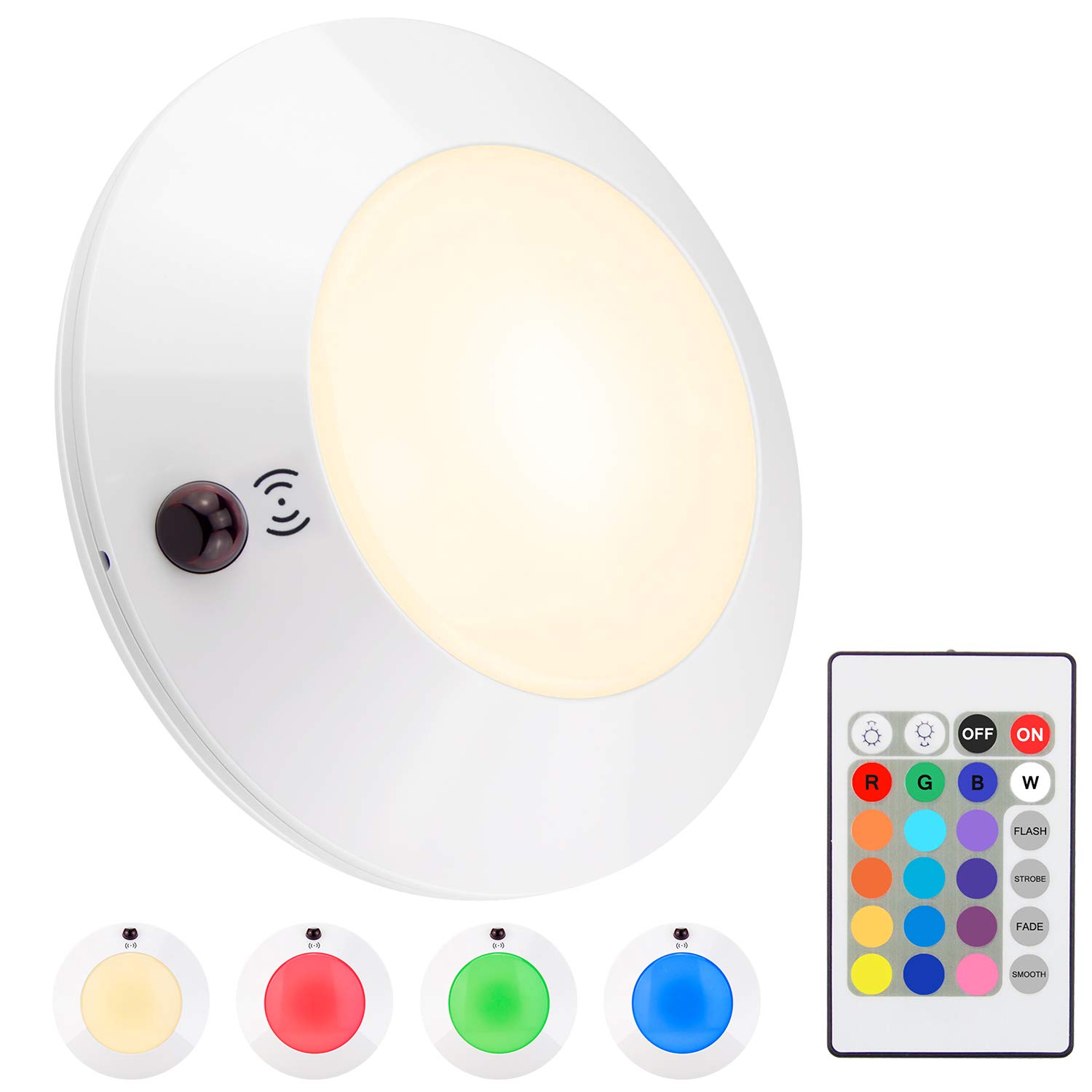 More Details * 300 Lumens, 4 super bright LEDs for each light, 3000K, 3W, DC 4.5V, lifespan is 80,000 Hours. * 2 ways operate:Press lens or remote control.The remote control can operate the light within 25 feet. * Powered by 3C-Cell batteries (not included), and each set of batteries’ run time is 70 hours. * Hold the tap lens switch to select brightness (100%~1% ) as you wish. * Choose a color from the 16 colors by pressing a corresponding color button.Set brightness and color-changing modes at FLASH/ STROBE/ FADE/ SMOOTH. * Easy to install with screws(included). * Can be used anywhere bathroom, hallway, wedding, party decoration,corridor, bedside, closet, shower, pantry, shed, Kitchen, baseroom, shelf, cabinet, laundry, entrance etc. Packing List - 1 x LED Ceiling Light - 1 x Remote Control - 2 x Screws - 1 x User Manual