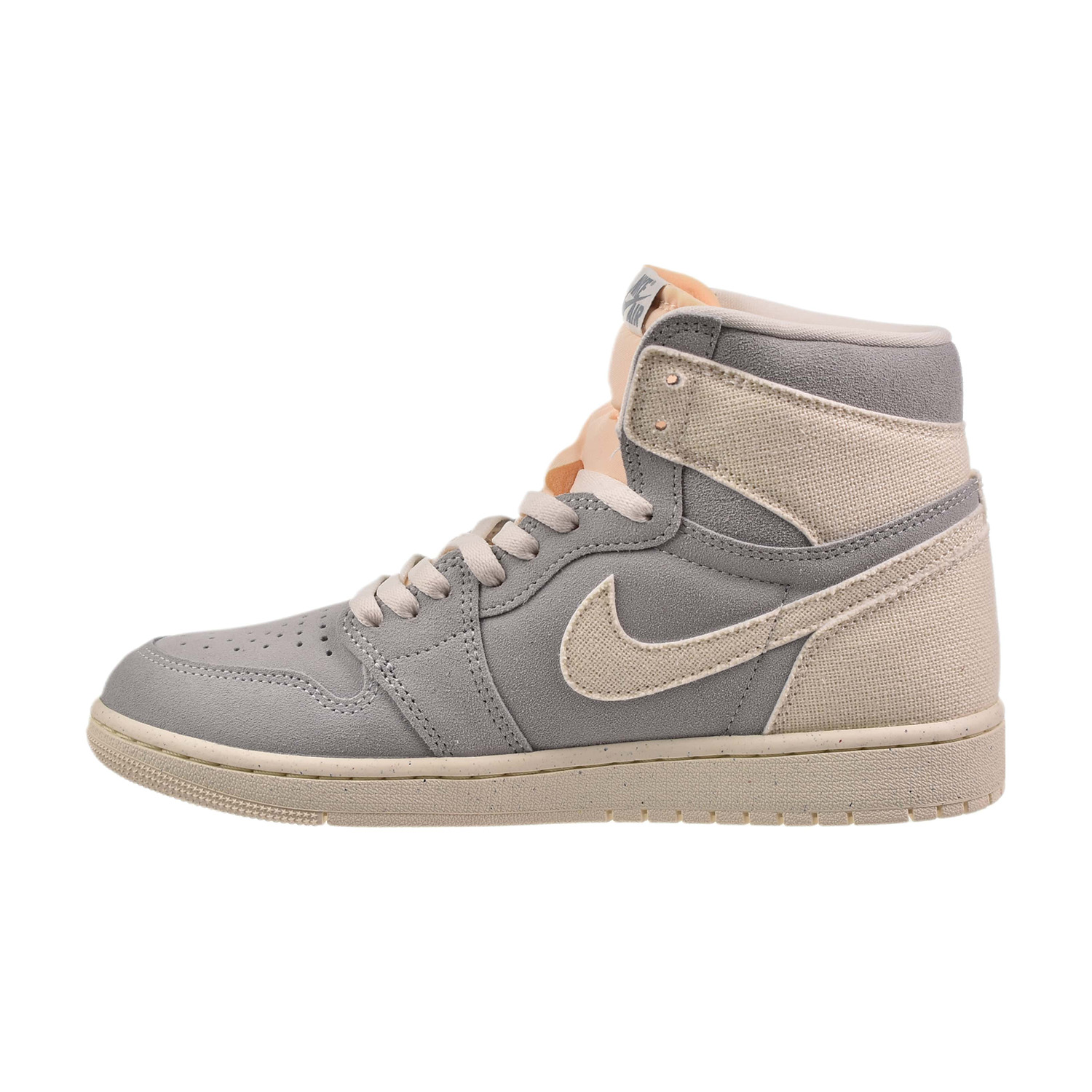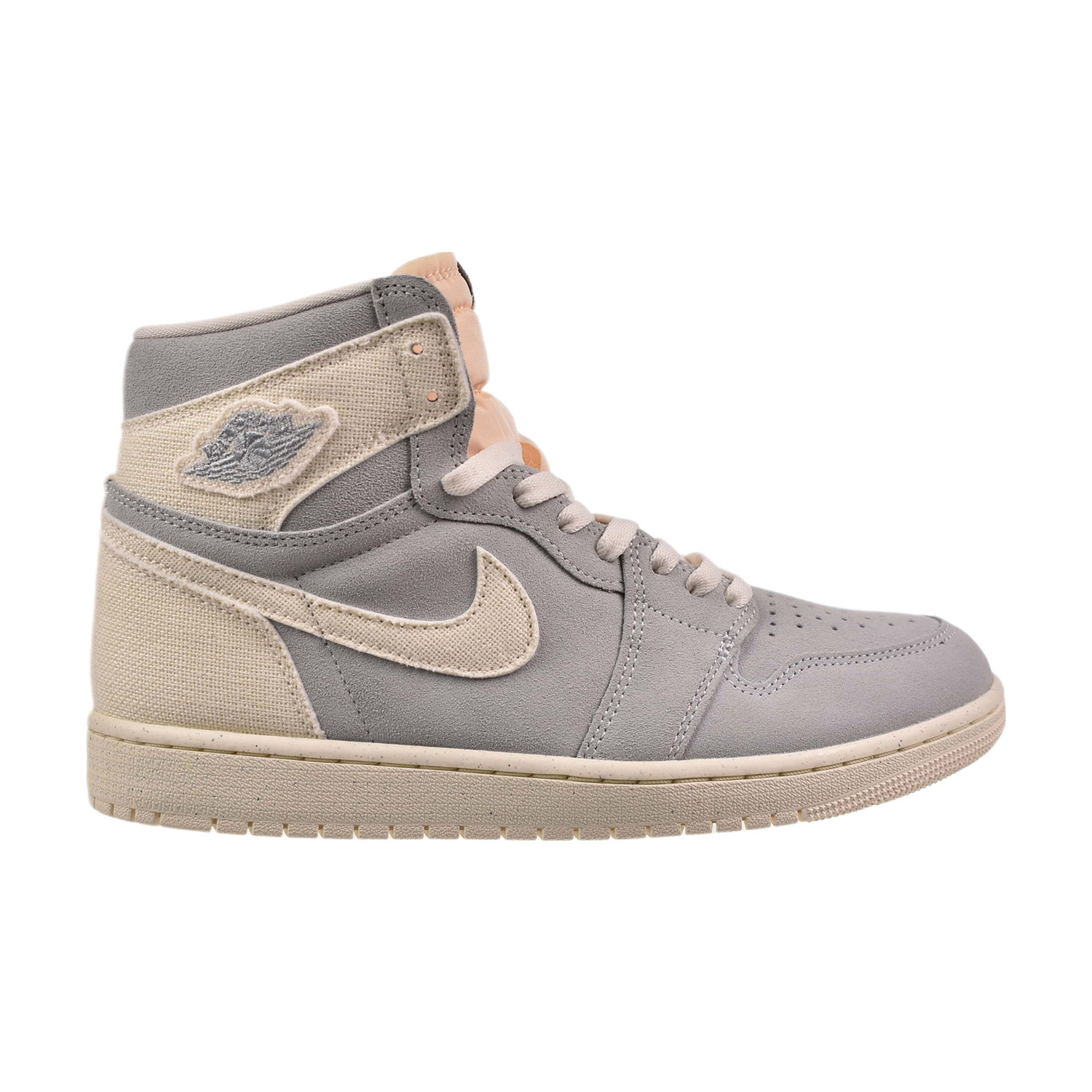 • This creamy tone and durable textile can also be found around the heel and on the Swoosh logos. The Jordan Wings logo is displayed near the ankle, on a canvas patch, in Sea Glass-colored embroidery.