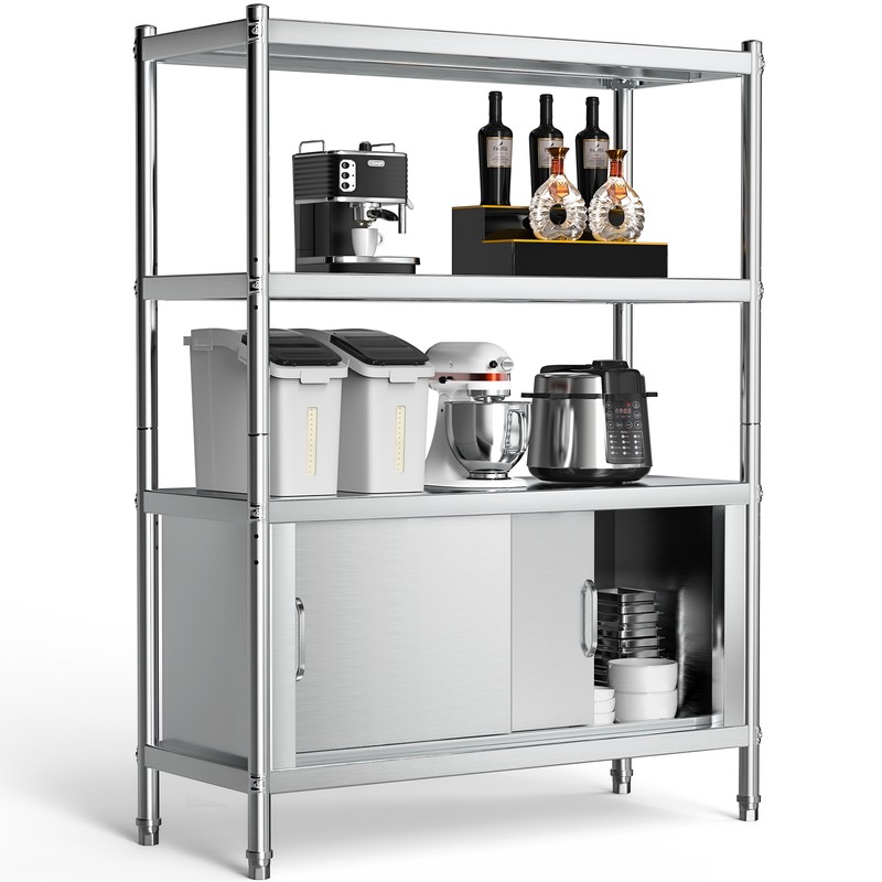 STRONG LOAD-BEARING: TAUS stainless steel shelves feature high-quality 201 stainless steel material that's corrosion-resistant, rust-proof, easy to clean, and long-lasting;The product size: 48"*18"*60"; The shelves have durable stainless steel plate, thickened tubes, and high-quality accessories to provide a total of 1200 LB load-bearing capacity
