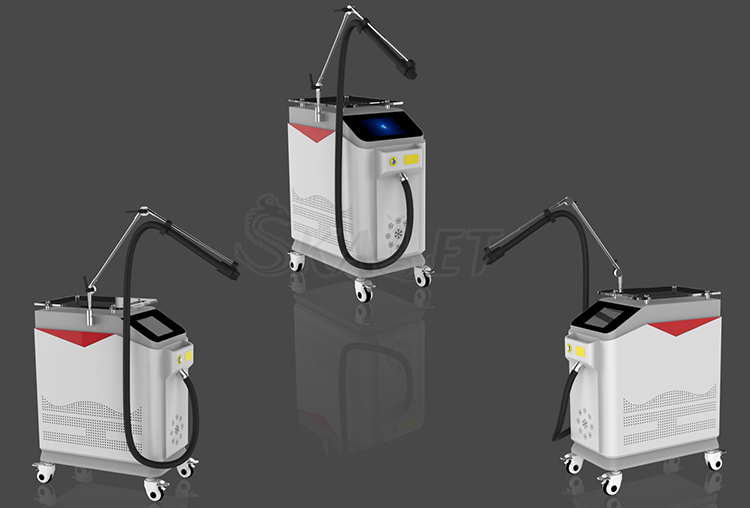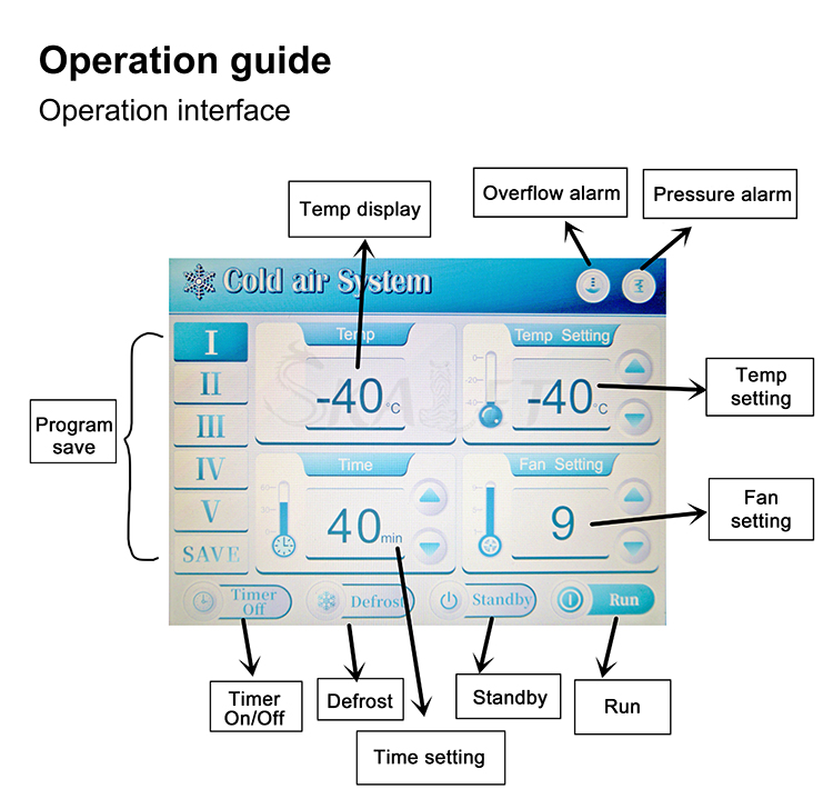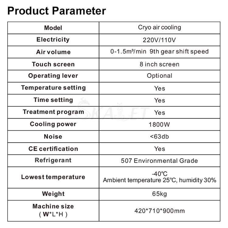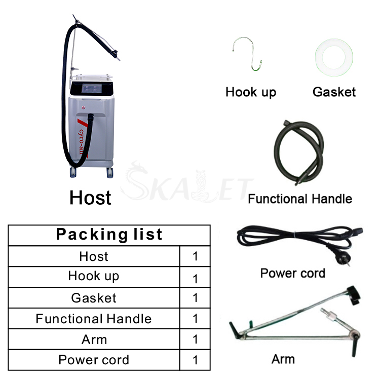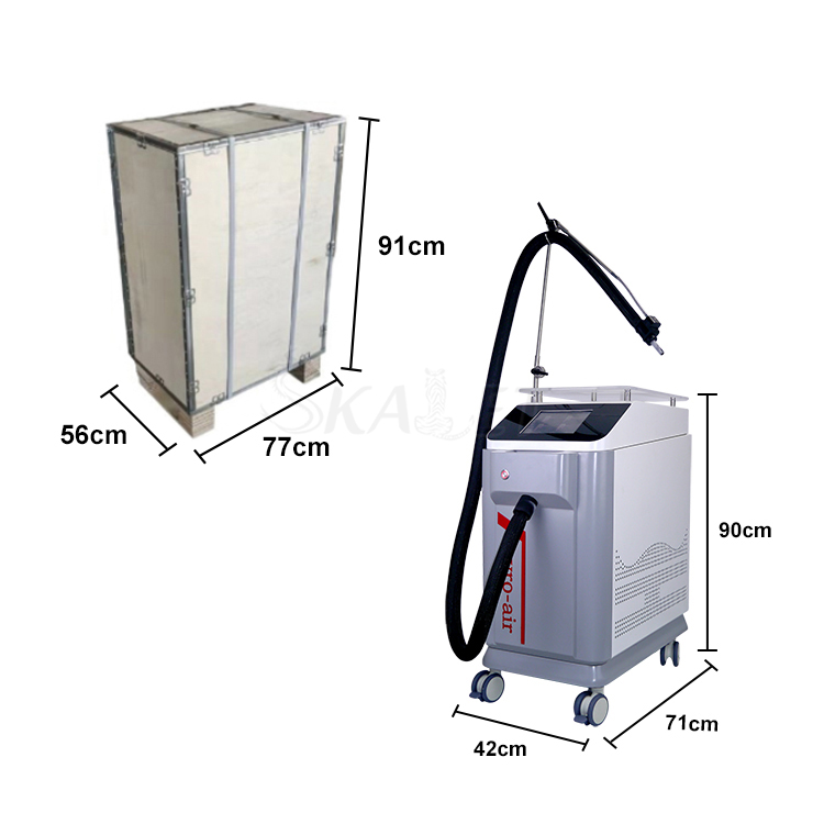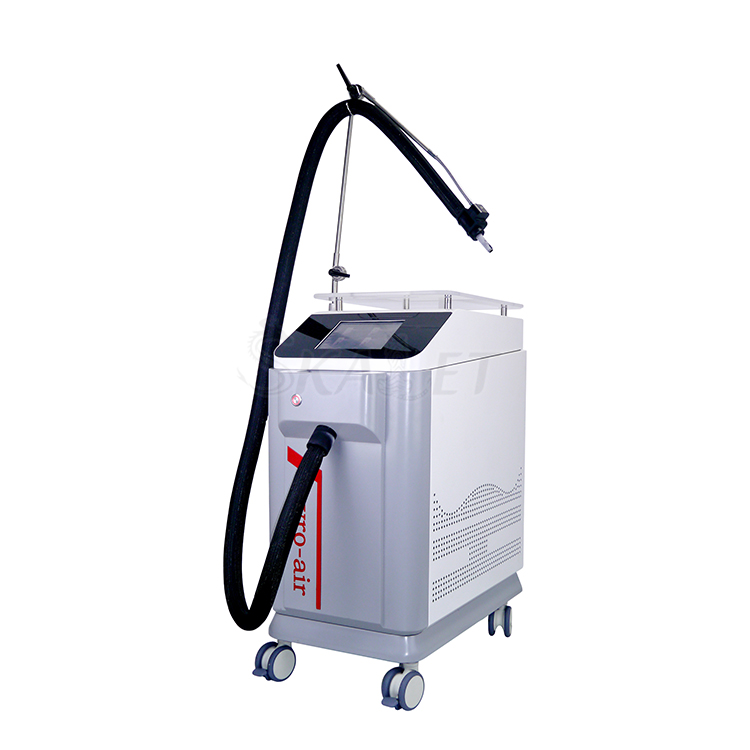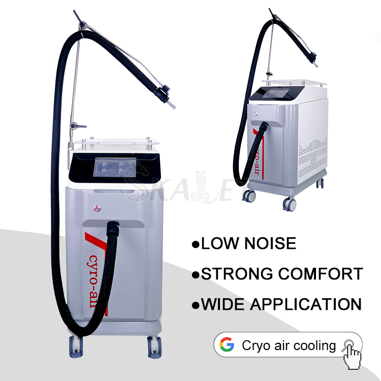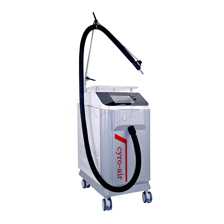 Principle This product uses frequency conversion air compressor device to compress the air and send out cold air through the refrigeration device to cool the epidermis so as to protect the epidermis, relieve pain and make the high energy density act on the target tissue without damaging the epidermis.