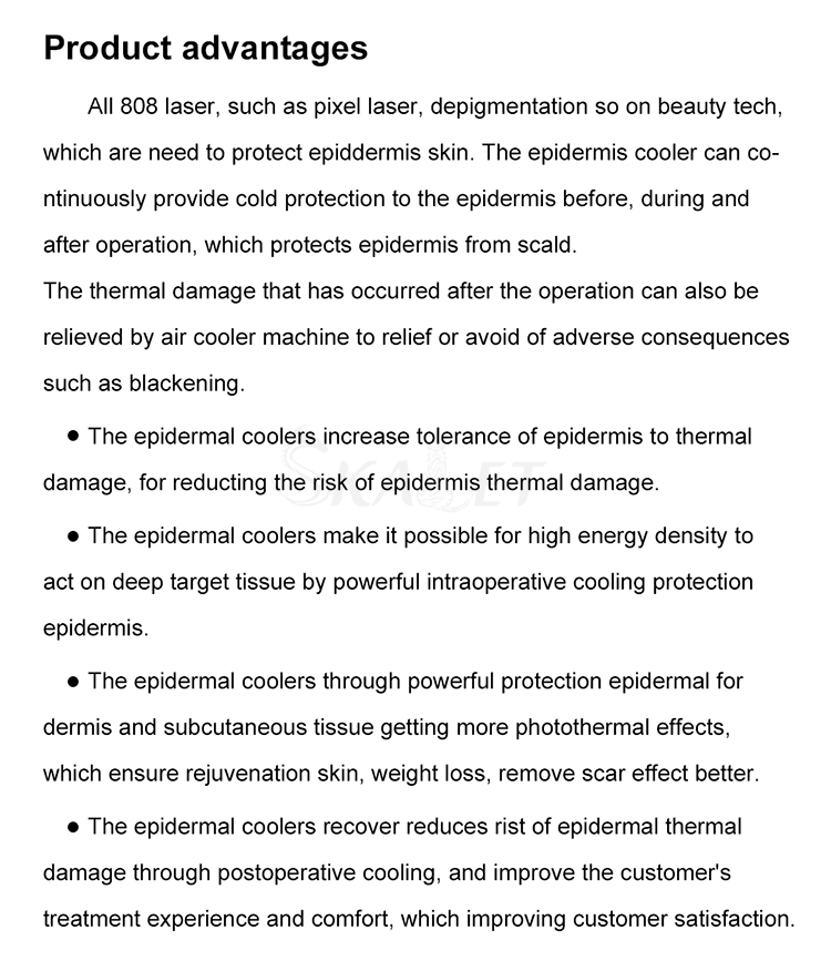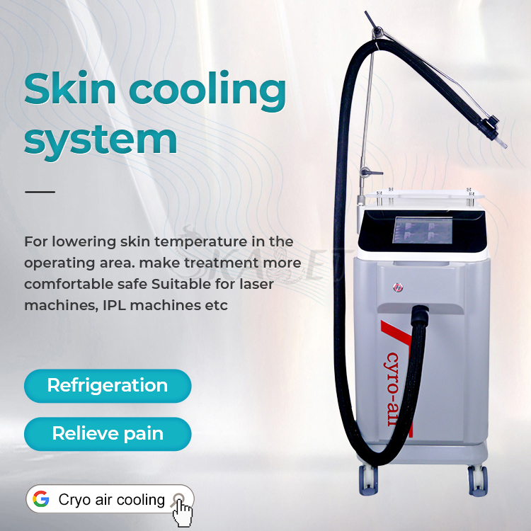 Function The professional skin cooling machine is specially for cooling skin before, during and after using of non-invasive CO fractional laser, Q switch laser, IPL or diode laser treatment; pain release for patients to avoid any burn or uncomfortable treatment; Also efficient pain treatment, swelling reduction and muscle relaxation. It can work with 808nm diode laser hair removal machine, co2 fractional laser machine, HR machine, IPL machine and Nd yag laser machine...Suitable for all machines if patients feel pain and needs cooling.