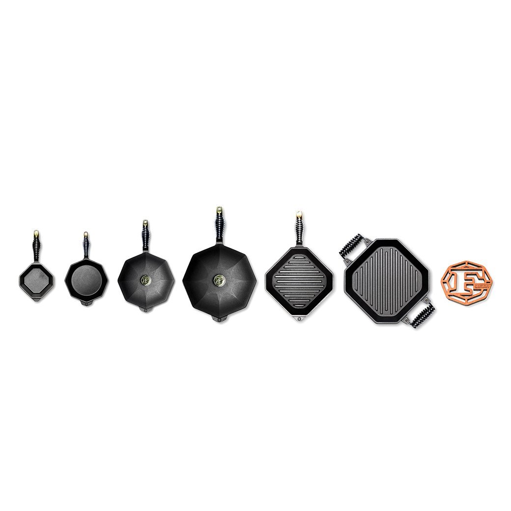 The ultimate cast iron cookware set for those with a deep passion for cast iron and want nothing but the best. Simply put, when you invest this handcrafted collection, you all be prepared for any cast iron cooking challenge for parties large and small. That includes searing and grilling, cooking indoors and out, on the stove or in the oven from meats to vegetables, breads to desserts. Handcrafted American quality and guaranteed good forever.