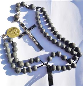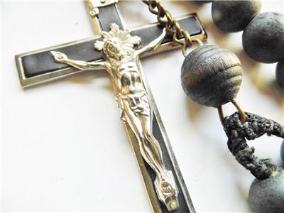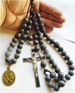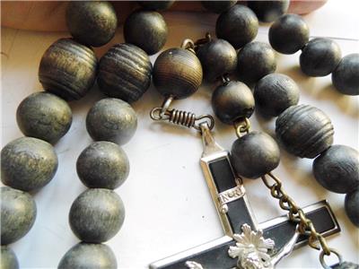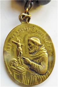 Measures approx. 31inch long (77cm) . Beads are all made from turned wood sometime ca.1880 with a large Brass St. Francis Miraculous holy medal at the opposite end of the Crucifix. These rosaries were used by Nuns and Monks, Friars.