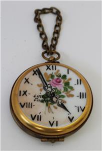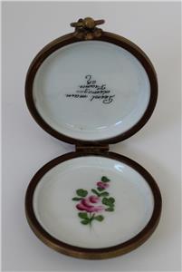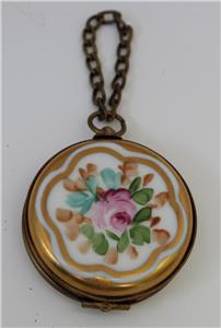 A peint main Limoges trinket box formed as a fob watch measuring 1 3/4" in diameter. The watch dial has Roman numerals and has a pink rose with green & gold leaves; also marked 'Limoges France' in the center. The back has a pink rose with green & brown leaves highlighted in gold. Please see all the pictures to appreciate the quality. Inside the base is painted another pink rose and green leaves. The box is in very good condition with no damage whatsoever. Marked inside the top 'Peint Main Limoges France and artists initials. The box is complete with fob chain.