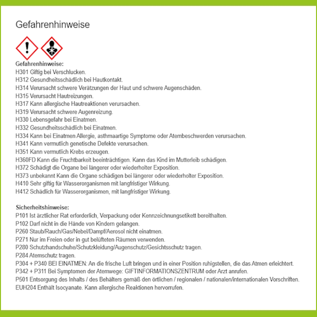 EUH204 Enthält Isocyanate. Kann allergische Reaktionen hervorrufen.