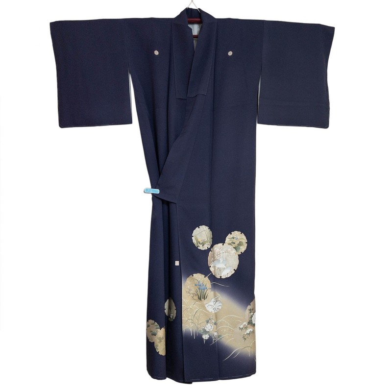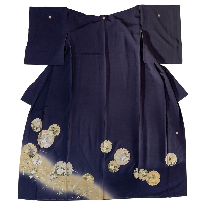 It is made of luxurious purple silk with five Katabami-Mon family crests. The design is a gorgeous swath of cream across the bottom, with “Yukiwa" containing birds, flowers, etc. There is the seal of the maker inside as well as a “Pearltone” tag - which is a kind of stain-resistant treatment for silk.